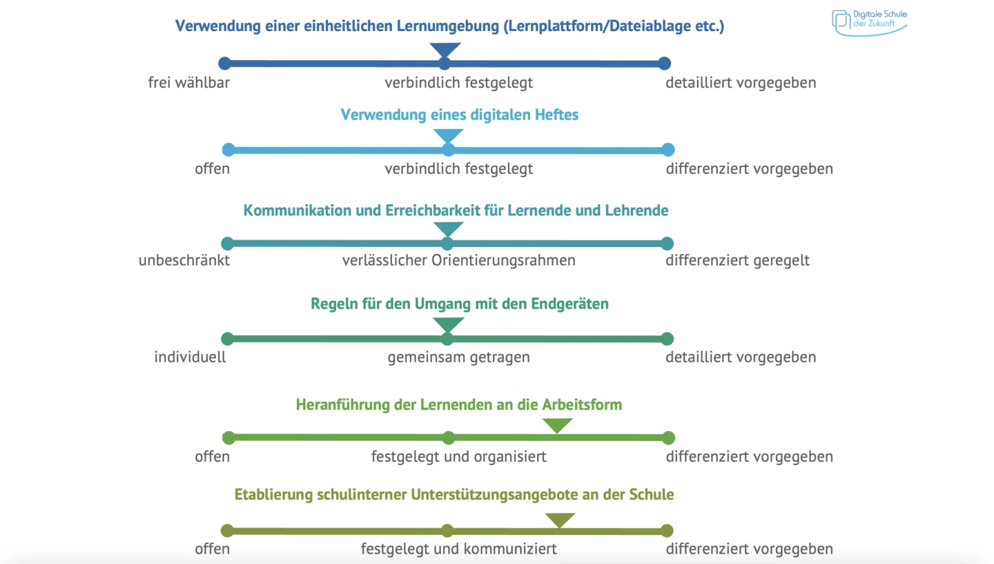 Wichtige Rahmenbedingungen, wie beispielsweise die Frage nach der Verwendung einer einheitlichen Lernplattform oder einer fest strukturierten Dateiablage, müssen für alle Beteiligten an der Schule klar sein. Jede Lehrkräfte kennt diese Rahmenbedingungen, hält sich an bindende Absprachen und fordert diese auch bei den Lernenden konsequent ein.