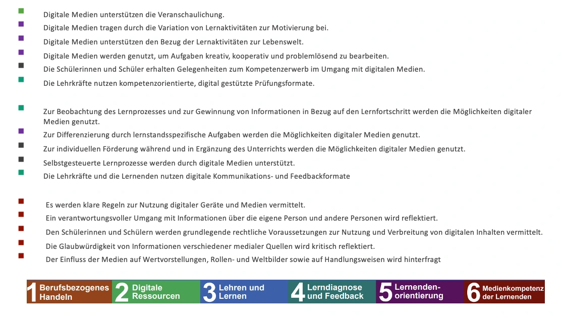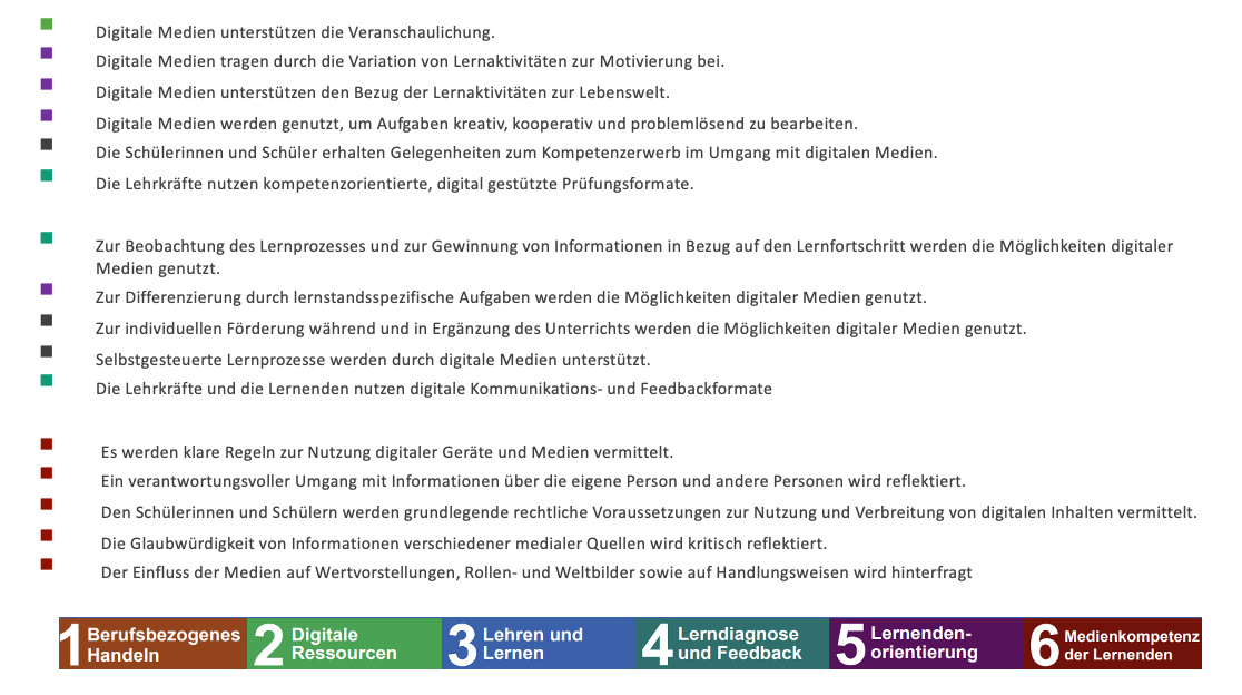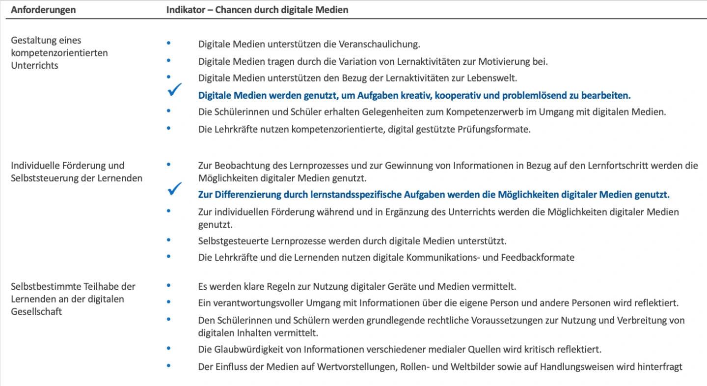 In Rahmen der Evaluation wurden innerhalb der oben genannten Merkmale Indikatoren definiert, anhand derer eine erfolgreiche Integration digitaler Medien in den Unterricht erkennbar wird: