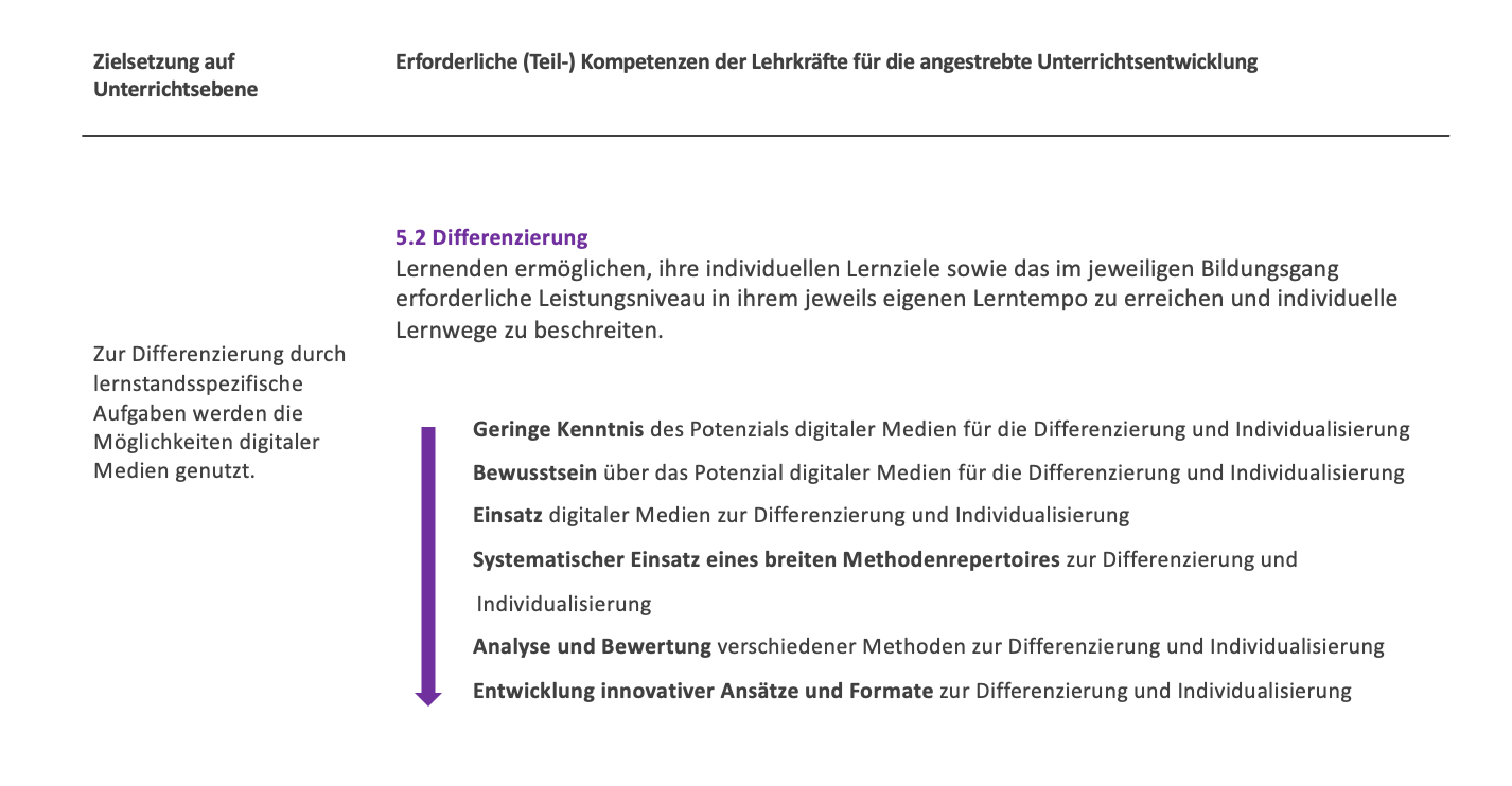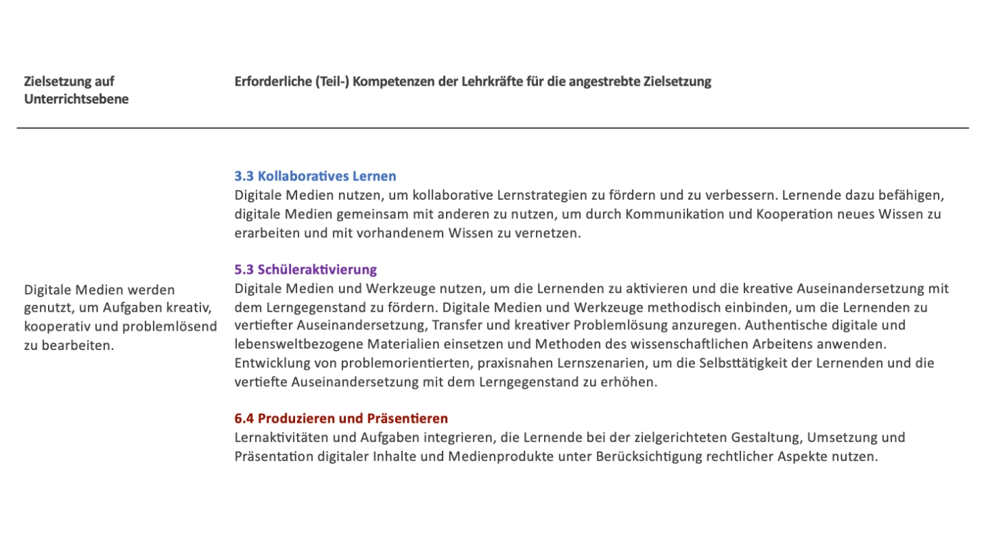 Aus den Zielsetzungen auf Unterrichtsebene können mithilfe des DigCompEdu Bavarias die erforderlichen Kompetenzen der Lehrkräfte direkt abgeleitet werden, wie folgendes Beispiel beschreibt.