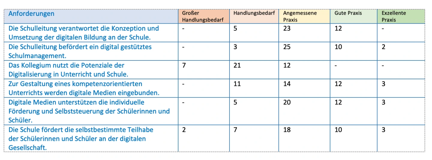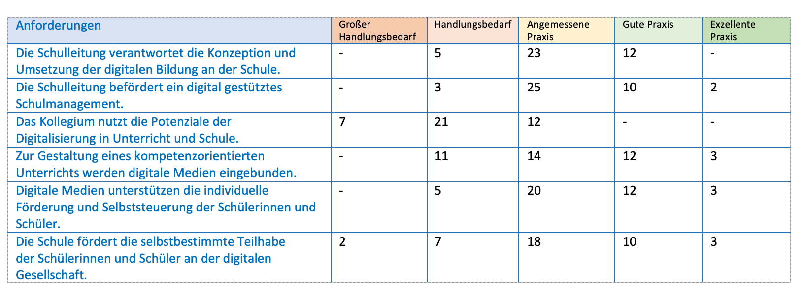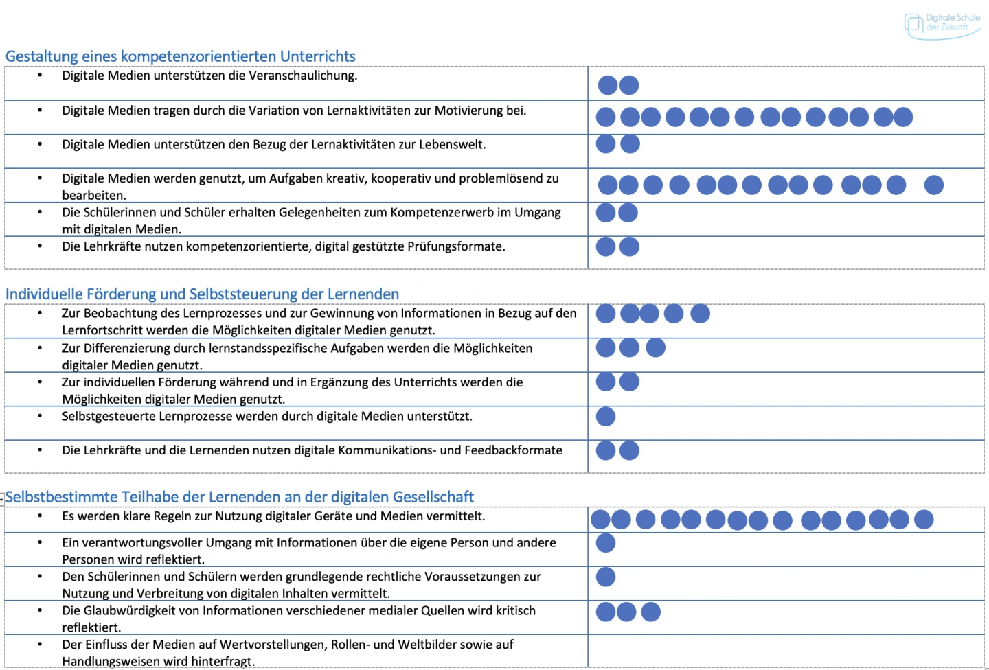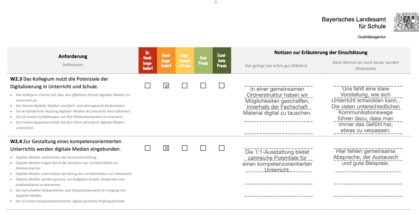 Mit der Neukonzeption der externen Evaluation besteht für die Schulen die Möglichkeit einer freiwilligen Selbsteinschätzung. Hierfür stellt die Qualitätsagentur Selbsteinschätzungsbögen zur Verfügung. Diese Selbsteinschätzungsbögen können die Schulen sowohl im Vorfeld einer externen Evaluation als auch zur regelmäßigen internen Evaluation nutzen. Die folgenden dargestellten Items sind diesem Bogen zum Wahlpflichtthemen „Digitalisierung” entnommen. Im Befragungssystems der Qualitätsagentur können diese Selbsteinschätzung auch online durchgeführt werden. Dazu erfolgt eine anschließende automatischer Auswertung der Ergebnisse.