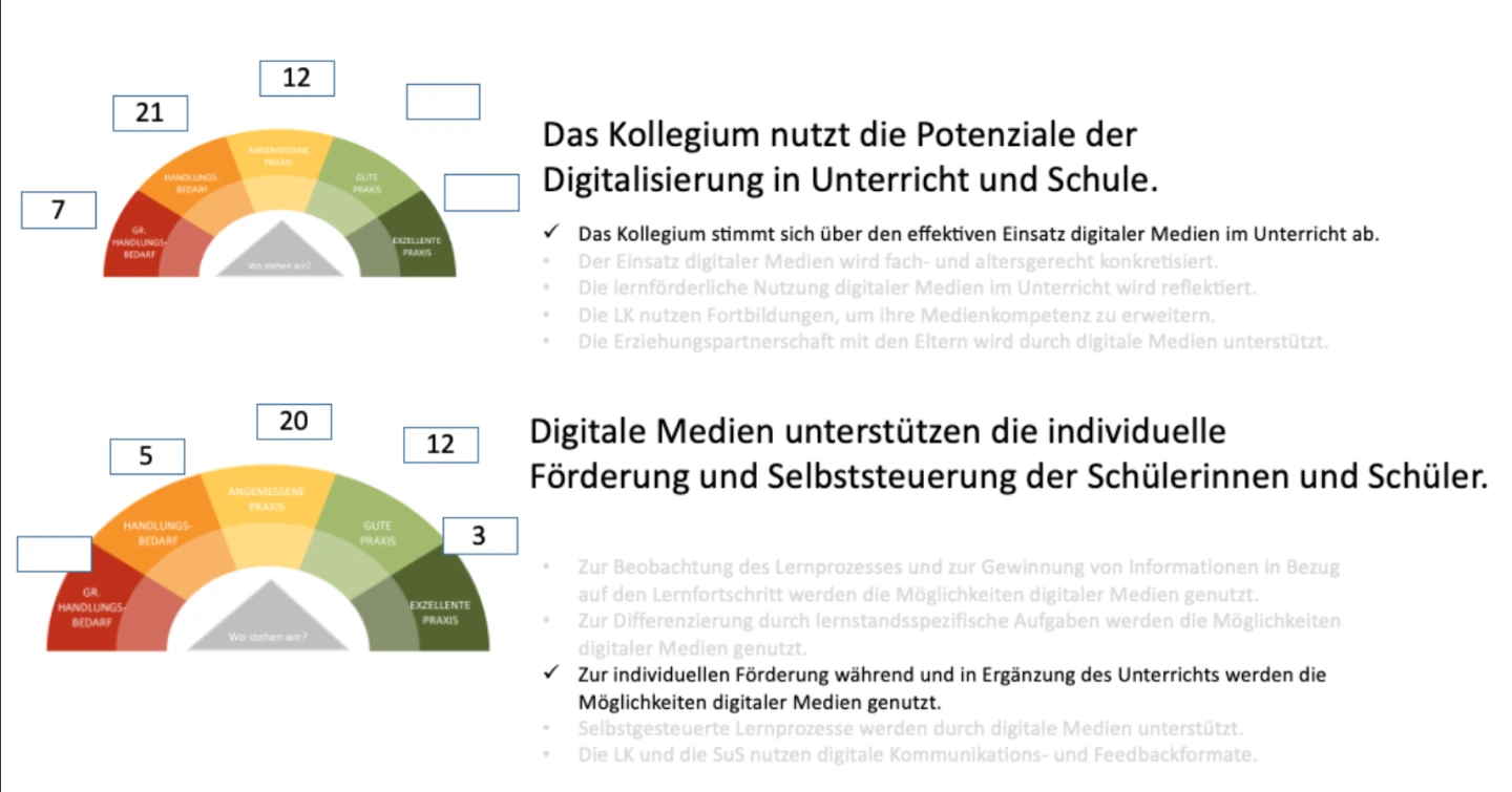 Im Anschluss daran erhält das gesamte Kollegium die Möglichkeit, sich anonym an einer Umfrage zu beteiligen. Jede einzelne Person schätzt zunächst für sich ein, inwiefern er oder sie die Anforderung an der Schule insgesamt erfüllt sieht. Die Einschätzungen können durch Notizen erläutert werden.