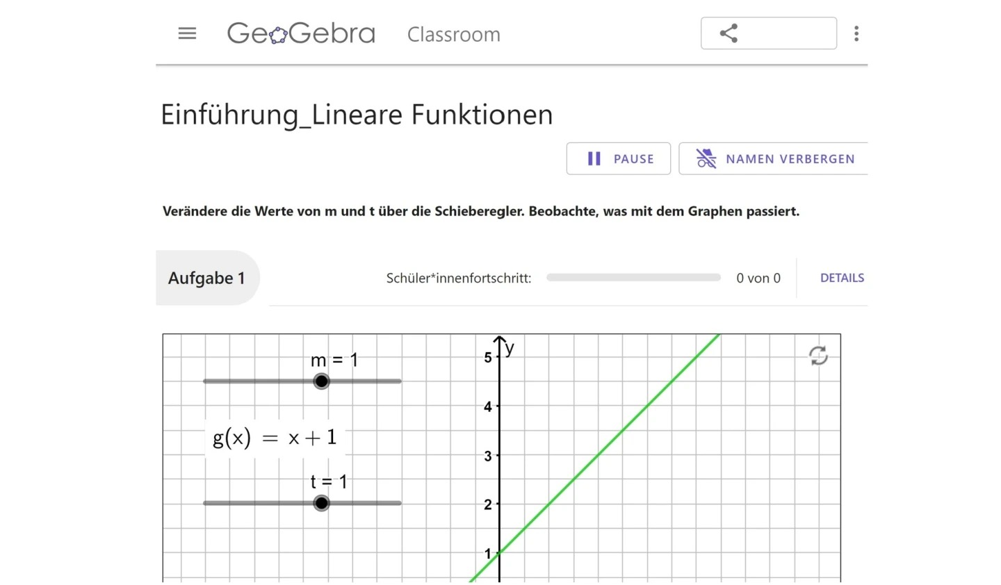 erstellt von Sebastian Schnurrenberger Sebastian: „Mit GeoGebra Classroom können gerade für Funktionsuntersuchungen Lernumgebungen erstellt werden. Die Auswirkungen von Parametern im Funktionsterm können über Schieberegler dynamisch beobachtet werden. Die Beobachtungen müssen beschrieben werden, wobei die Lehrkraft die Beschreibungen in Echtzeit einsehen kann. Kontrollfragen als Multiple Choice sichern grundlegende Erkenntnisse.”