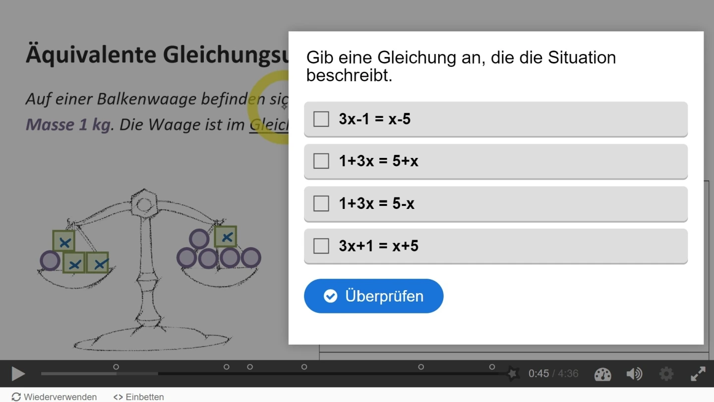Interaktives Erklärvideo zur Einführung von äquivalenten Gleichungsumformungen; erstellt von Sebastian Schnurrenberger (CC BY SA 3.0)