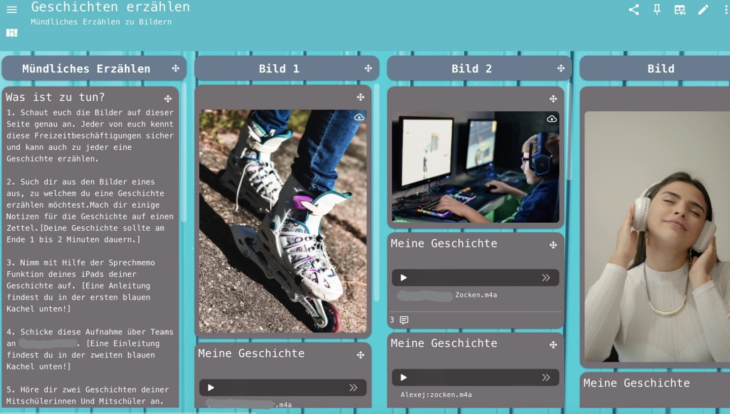 Die Arbeitsanweisungen und Bildvorlagen zur Vorbereitung einer Erlebniserzählung können den Schülerinnen und Schülern über eine digitale Pinnwand zur Verfügung gestellt werden. Eine Bearbeitung könnte weiterhin ganz analog erfolgen.