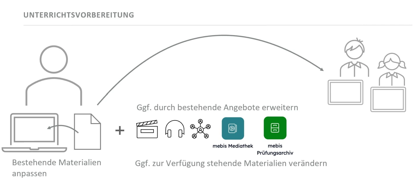 Unterrichtet eine Lehrkraft zum ersten Mal eine Klasse in einer 1.1-Ausstattung, muss sie ihre bestehenden Unterrichtsmaterialien an die neue Unterrichtssituation anpassen. Im einfachsten Fall bedeutet das, Arbeitsblätter zu digitalisieren oder bestehende Materialien der Verlage in die Lernplattform zu integrieren. Perspektivisch gesehen befähigt eine kompetente Nutzung der digitalen Endgeräte dazu, diverse neue, digital gestützte Möglichkeiten in die Unterrichtsvorbereitung und den Unterricht einzubauen. Folglich kann sowohl auf Seite der Lehrkraft als auch der Lernenden eine neu gewonnene Motivation entstehen, Unterricht anders und aktiver zu gestalten.