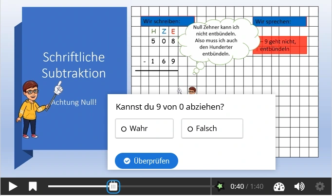 „Schülerinnen und Schüler erlernen bei uns ausgewählte Unterrichtsinhalte über interaktive Erklärvideos. Im Unterricht bekommen sie Übungsangebote auf unterschiedlichen Niveaustufen; teilweise Übungen aus dem Schulbuch, Übungen mit Materialien wie z. B. mit Steckwürfeln, teilweise digitale Übungen. Die Lehrkraft ist Lernbegleiter in dieser intensiven Übungsphase und kann viel individuell unterstützen.“