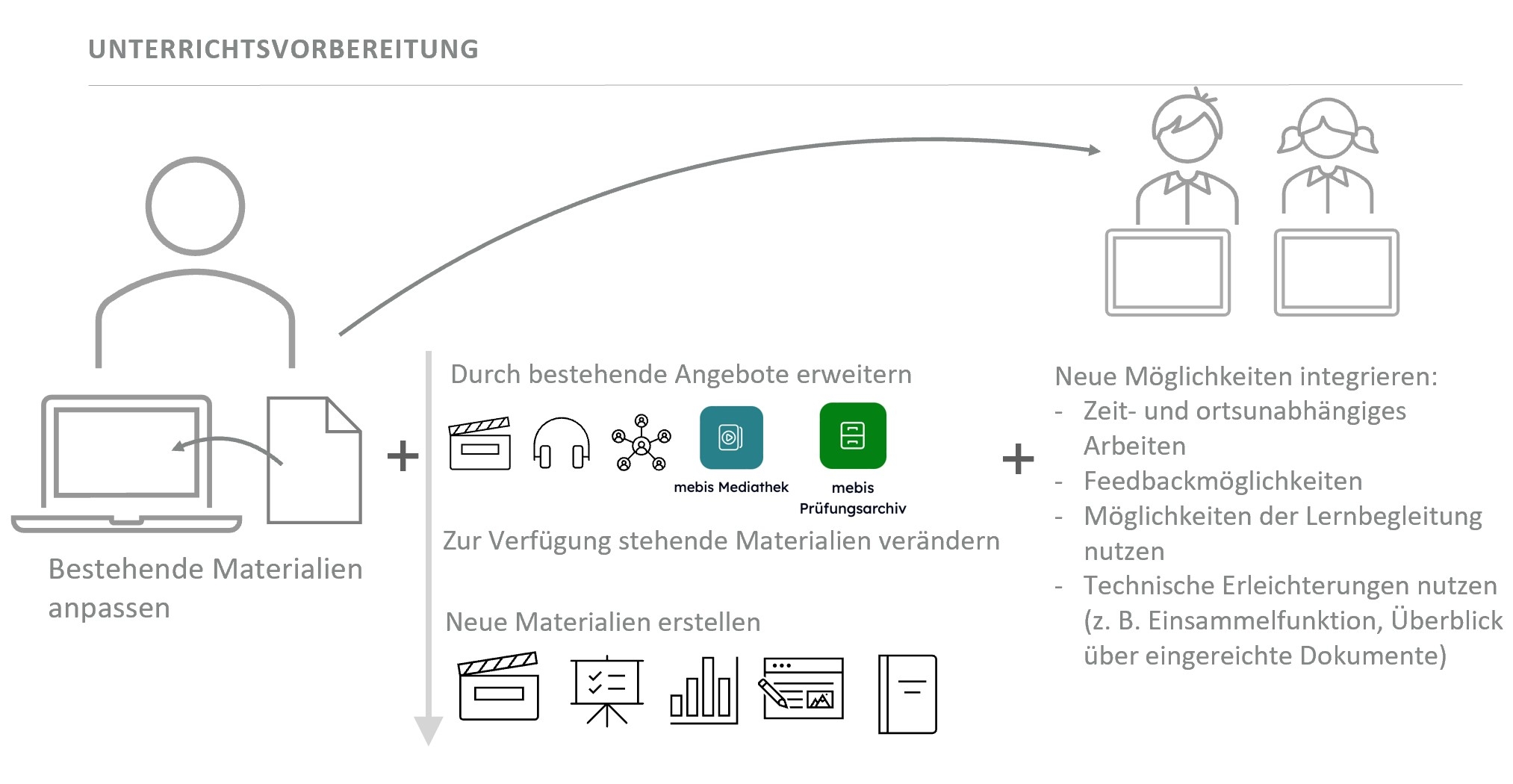 Unterrichtet eine Lehrkraft zum ersten Mal in einer Klasse mit mobilen Endgeräten, muss sie ihre bestehenden Unterrichtsmaterialien an die neue Unterrichtssituation anpassen. Im einfachsten Fall bedeutet das, Arbeitsblätter zu digitalisieren oder bestehende Materialien der Verlage in die Lernplattform zu integrieren. Perspektivisch gesehen befähigt eine kompetente Nutzung der digitalen Endgeräte dazu, diverse neue, digital gestützte Möglichkeiten in die Unterrichtsvorbereitung und den Unterricht einzubauen. Folglich kann sowohl auf Seite der Lehrkraft als auch der Lernenden eine neu gewonnene Motivation entstehen, Unterricht anders und aktiver zu gestalten.
