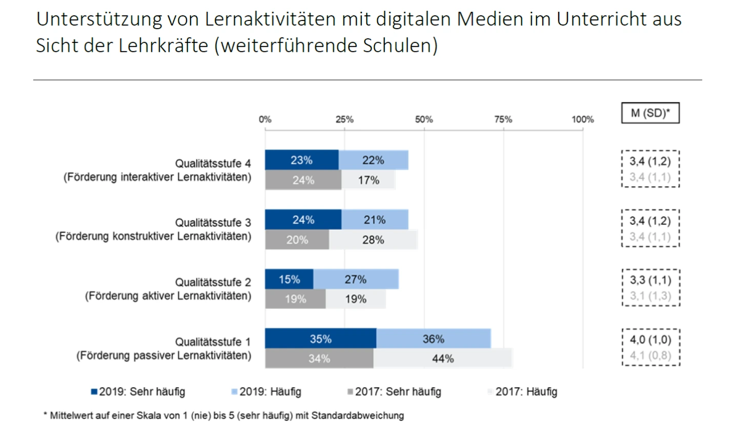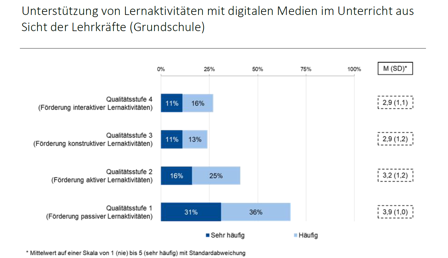Die Studie 2021 stellt beim Einsatz von digitalen Medien nach wie vor einen Schwerpunkt bei der Förderung von passiven Lernaktivitäten fest. Dennoch sehen die Studienautoren in diesem Ergebnis, dass die Lehrkräfte die Kompetenzen haben, alle Arten an Lernaktivitäten mit digitalen Medien einzusetzen.
