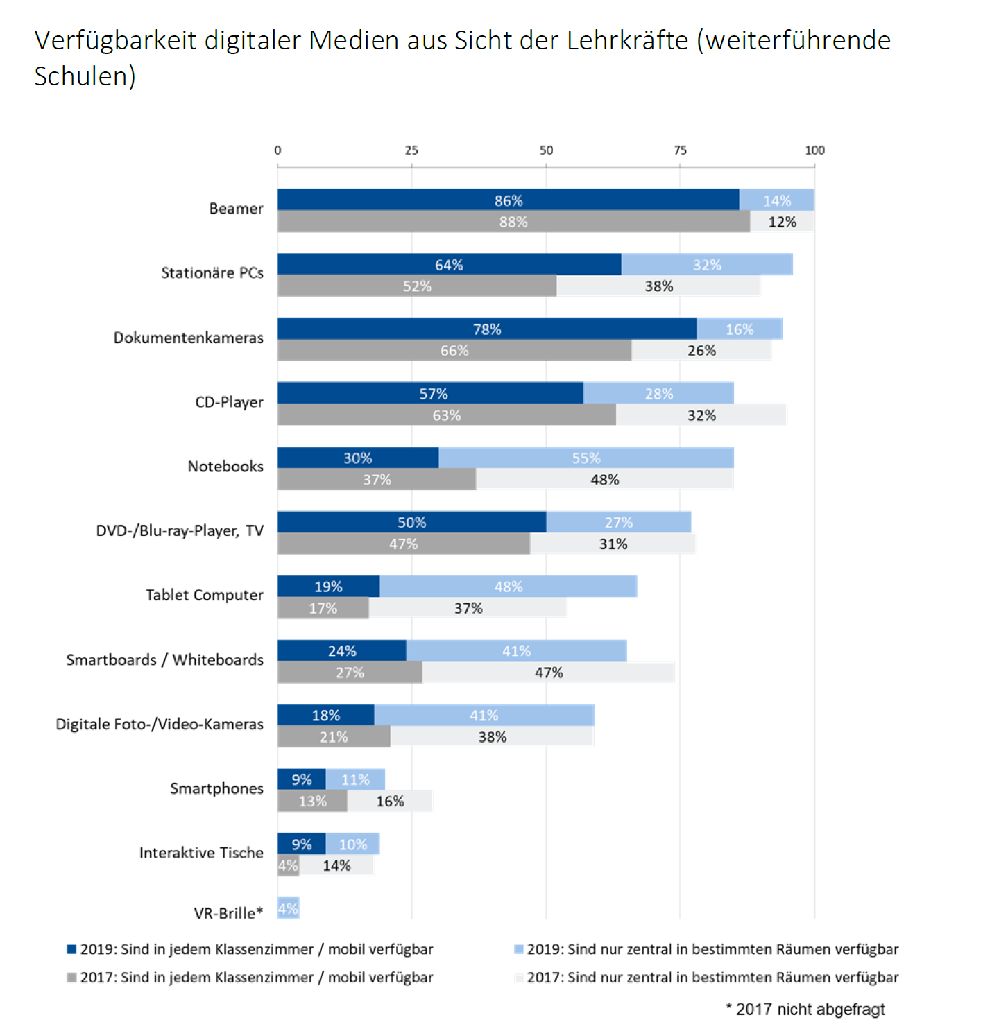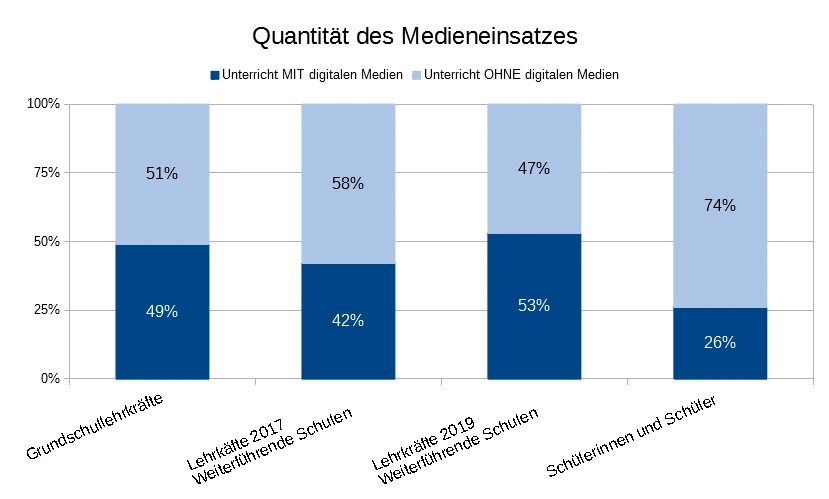 Der Anteil des digital gestützten Unterrichts beträgt über alle Schularten hinweg ca. 50% . An weiterführenden Schulen hat sich innerhalb der zwei Jahre zwischen den Studien der Anteil digital gestützten Unterrichts von 42% auf 53% erhöht. Damit sind digitale Medien bereits vor der Corona-Pandemie ein fester Bestandteil des Unterrichtens.