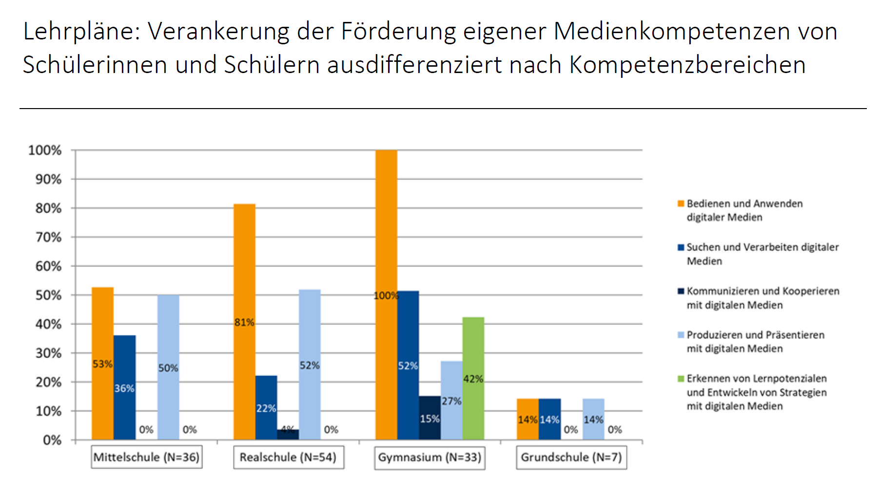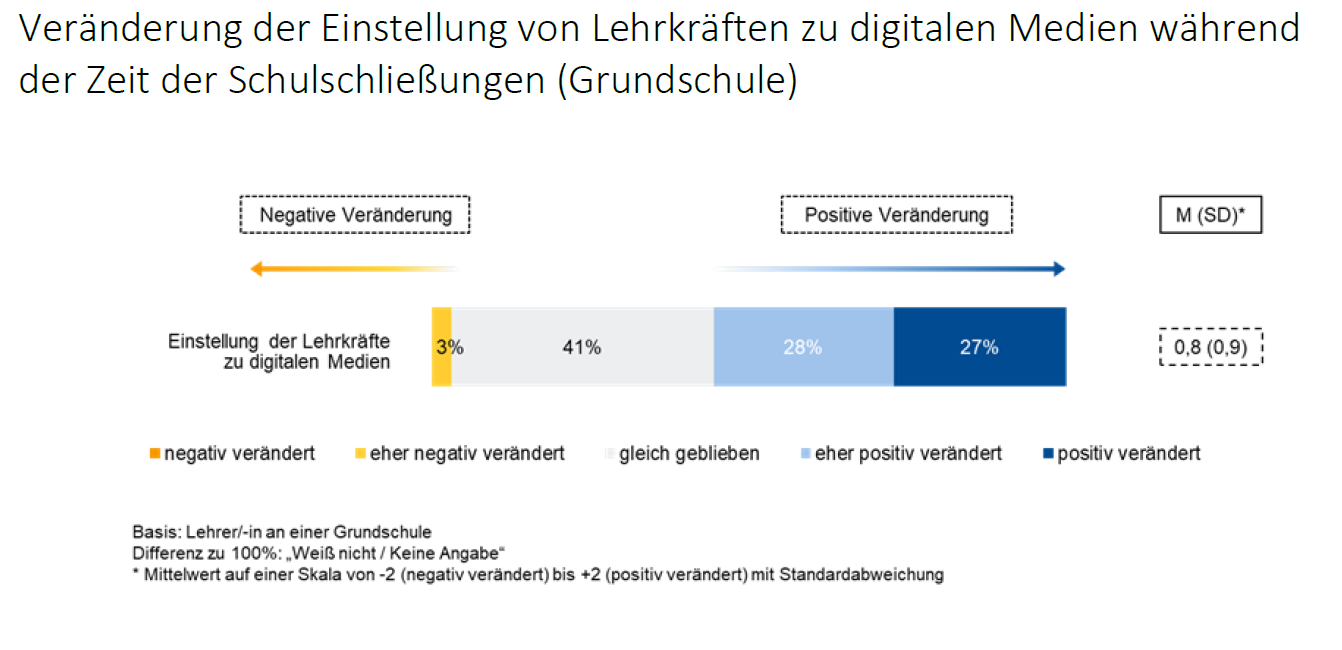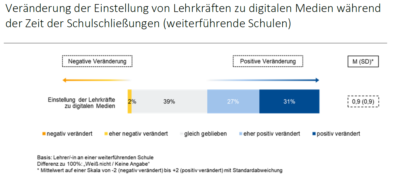 Laut Studie haben sich die medienbezogenen Kompetenzen bei Lehrkräften an allen Schularten erweitert. Insbesondere die Corona-Pandemie hat dazu beigetragen, dass der sich der Unterricht weg von einem rein präsentationsorientierten Medieneinsatz hin zu einer stärker schüleraktivierenden Mediennutzung weiterentwickelt hat. Die Studie sieht aber bei einer relativ kleinen Gruppe an Lernenden auch klare Nachteile durch das digitale Lernen zu Hause.