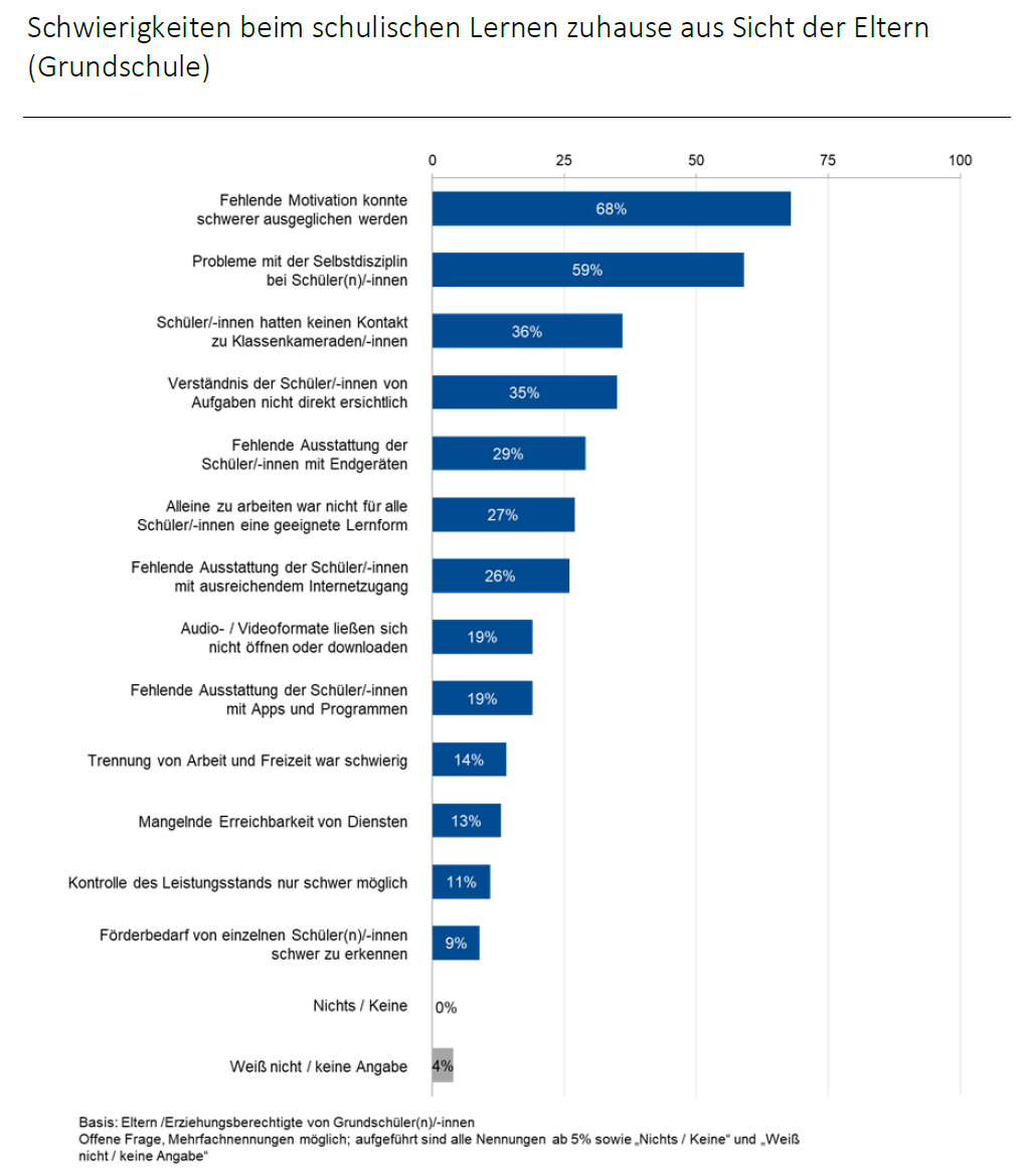 Alle Beteiligten sehen aber in der Selbststeuerung das größte Problem für ein erfolgreiches Lernen. Hierbei stellt sich die Frage, inwiefern bereits vor der Corona-Pandemie die Vermittlung von entsprechenden Lernstrategien im Unterricht gegebenenfalls zu kurz gekommen ist oder vermittelte Lernstrategien für digitales Lernen ungeeignet gewesen sind.