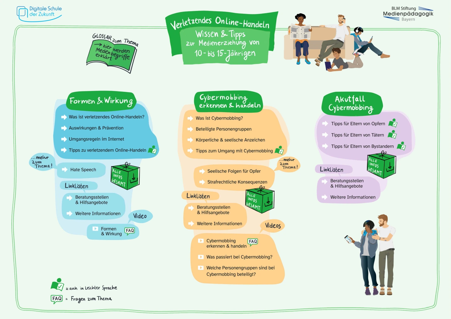 Was ist Cybermobbing und warum ist es für Betroffene so schlimm? Wer ist beim Cybermobbing beteiligt? Woran erkennt man, dass jemand online gemobbt wird? Was kann man tun? Wenn es um Medienerziehung geht, haben viele Eltern und Erziehungsberechtigte Fragen. Die BLM Stiftung Medienpädagogik Bayern bietet hierfür umfangreiche medienpädagogische Informationsmaterialien sowie FAQ- und Erklärvideos für Eltern.