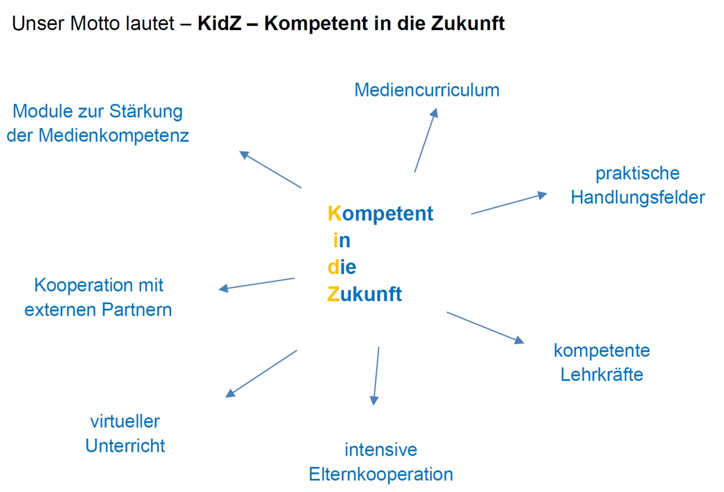 Unter dem Motto “KidZ - Kompetent in die Zukunft” werden in diesem Beispiel sieben verschiedene Handlungsfelder in den Blick genommen, um Medienkompetenz an der Schule zeitgemäß und umfassend zu fördern.