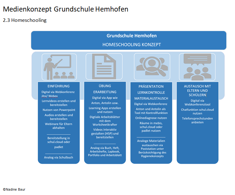 Das Konzept zum „Homeschooling“ verdeutlicht in kompakter Form, welche Medien und Werkzeuge für Übungs-, Erarbeitungs- und Präsentationsphasen, die Lernkontrolle und den Materialaustausch genutzt werden können. Darüber hinaus wird die digitale Kommunikation mit Eltern sowie Schülerinnen und Schülern festgelegt. Dies schafft Transparenz und Planungssicherheit für alle Beteiligten.