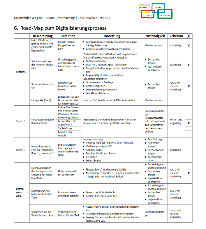 Anhand der von den Verantwortlichen abgezeichneten Vorhaben und Ziele wird in der Road-Map zudem deutlich, welche Maßnahmen zur Digitalisierung bereits umgesetzt wurden und welche noch ausstehen. Damit wird der Prozess der Digitalen Bildung langfristig in den Blick genommen und für alle nachvollziehbar dokumentiert.