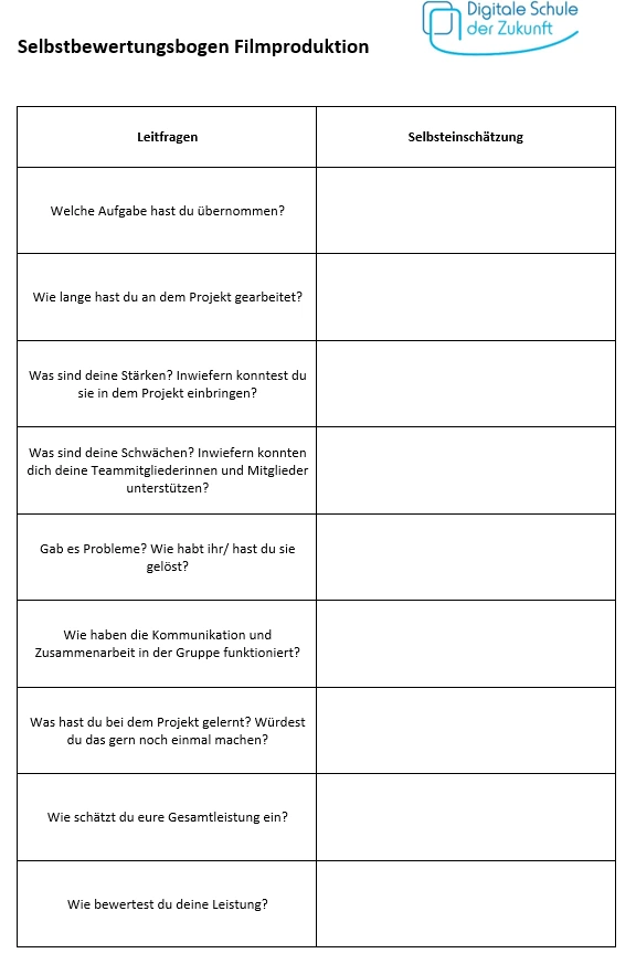 Des Weiteren kann ein Selbstreflexionsbogen eingesetzt werden, bei dem die Lernenden ihre eigene Leistung einschätzen und begründen. Für die persönliche Entwicklung der Heranwachsenden ist es wertvoll, eigene Stärken und Schwächen benennen zu können und Verantwortung für das eigene Lernprodukt zu übernehmen. Falls Selbsteinschätzung und Bewertung der Lehrkraft sehr weit auseinander gehen, kann dies auch Anlass für ein pädagogisches Gespräch sein, in dem man auf Basis der vorgegebenen Kriterien die Ergebnisse gemeinsam nachbespricht.