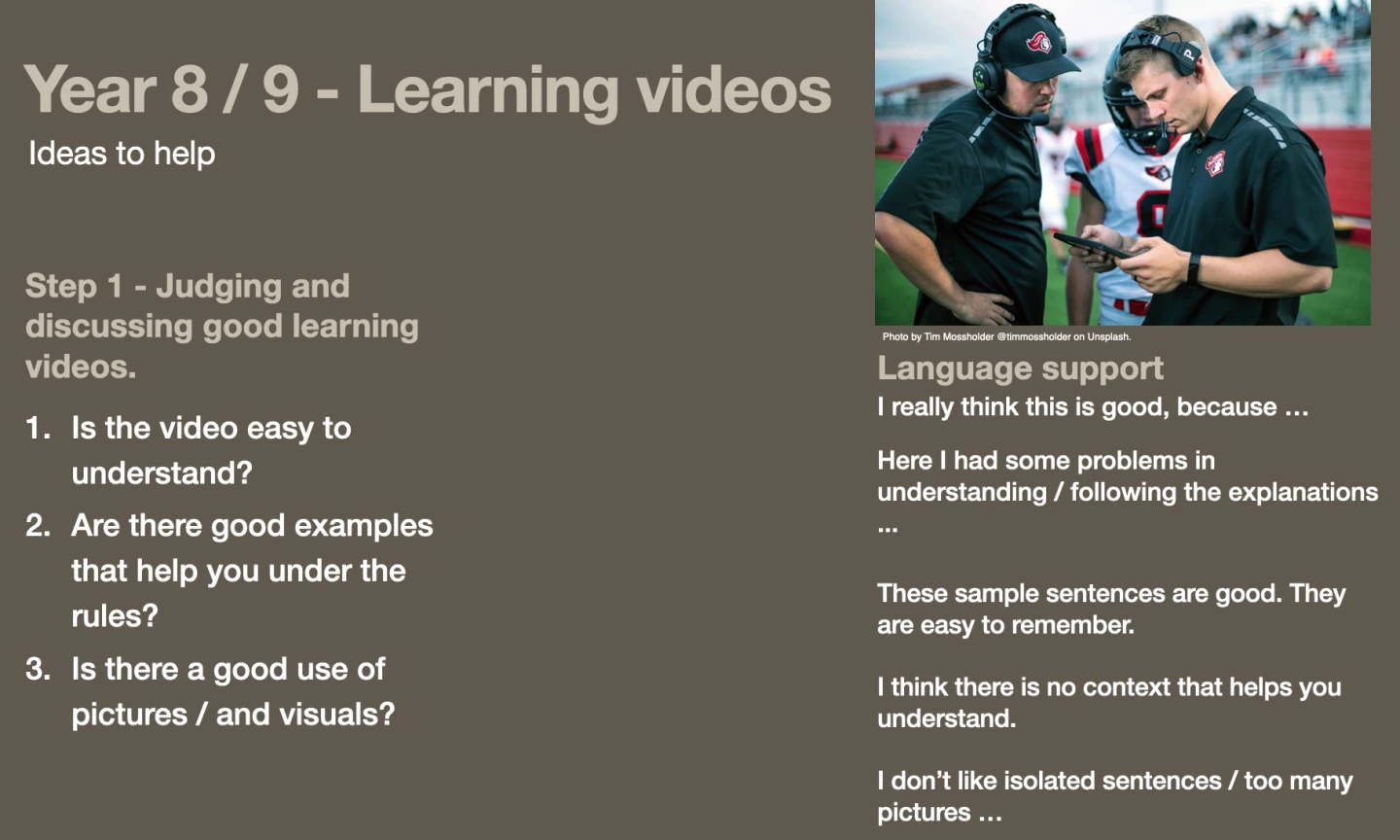 Bevor Schülerinnen und Schüler individuell oder in Kleingruppen mit der Produktion eigener Video- oder Audiodateien beginnen, sollten im Klassenverband zunächst Kriterien für gute Videos erarbeitet werden. Dies kann z. B. durch Best-Practice-Beispiele als Zielperspektive erfolgen oder den Vergleich zweier Beispiele, die sich im Niveau unterscheiden.