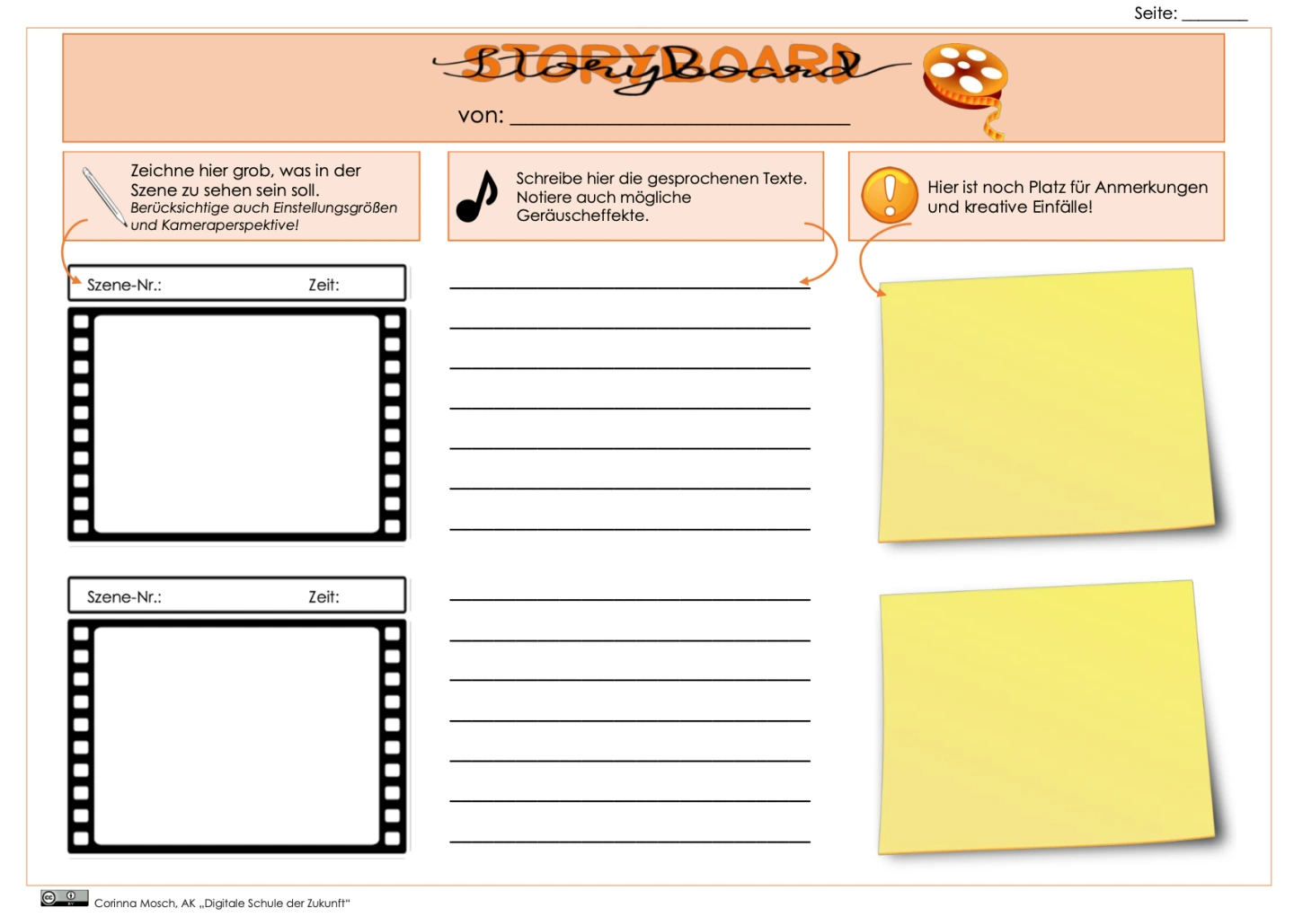 Vor der eigentlichen Produktion werden der Aufbau und die Konzeption des Films bzw. des Videos sowie die einzelnen Produktionsschritte besprochen. Eine wichtige inhaltliche Vorarbeit besteht in der Erstellung eines Drehbuchs und/ oder Sprechertextes oder Stichwortzettels. Dazu wird eine Vorlage bereitgestellt. Die Arbeitsanweisung (Vorlage), ein Beispiel für ein digitales Storyboard und ein Schülerprodukt finden Sie im Folgenden.