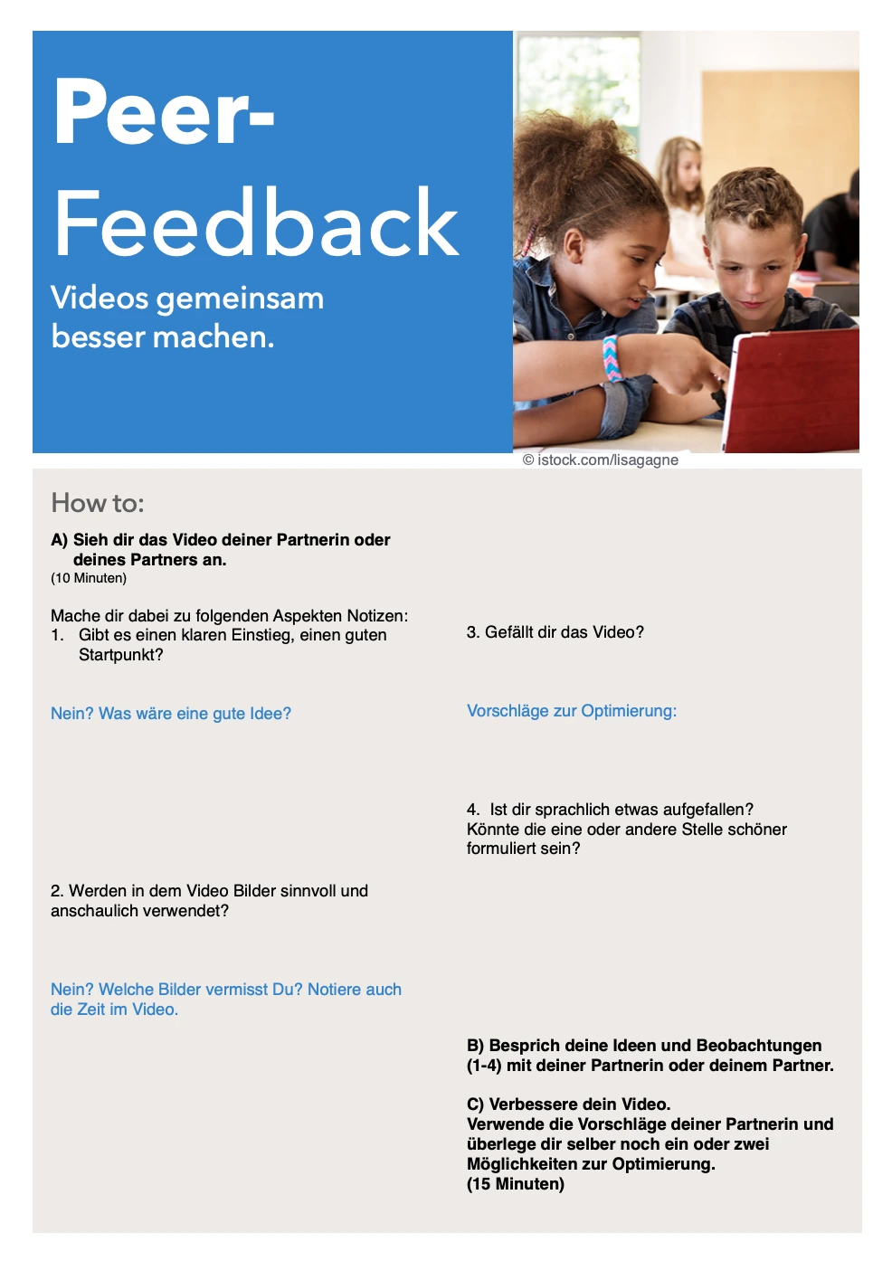 Lernprodukte hinsichtlich ihrer Qualität zu bewerten, fördert die Reflexionsfähigkeit der Lernenden. Sie setzen sich dabei bewusst mit ihren Ergebnissen oder den Produkten ihrer Mitschülerinnen und Mitschüler auseinander und lernen differenziert Rückmeldung zu geben. Peer-Feedback kann demnach gezielt verwendet werden, um Überarbeitungsprozesse anzuleiten.