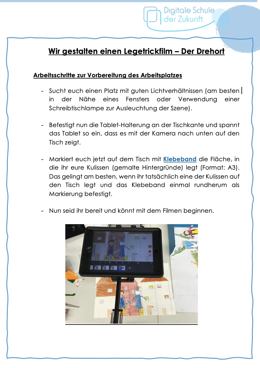 „Ich habe die Erklärvideos (Legetechnik) im Unterricht mithilfe der Tablet-Halterung aus dem Klassenzimmer drehen lassen. Für zuhause war es ratsam, das Handy auf den Schreibtisch zu legen und die Kamera des Geräts über die Tischkante zu schieben. Die Blätter für das Video lagen dann am Boden und konnten bequem abgefilmt werden. Hierbei mussten die Schülerinnen und Schüler auf ausreichend Beleuchtung achten (Deckenlampe und Schreibtischlampe). Die Ergebnisse waren sehr gut. ”