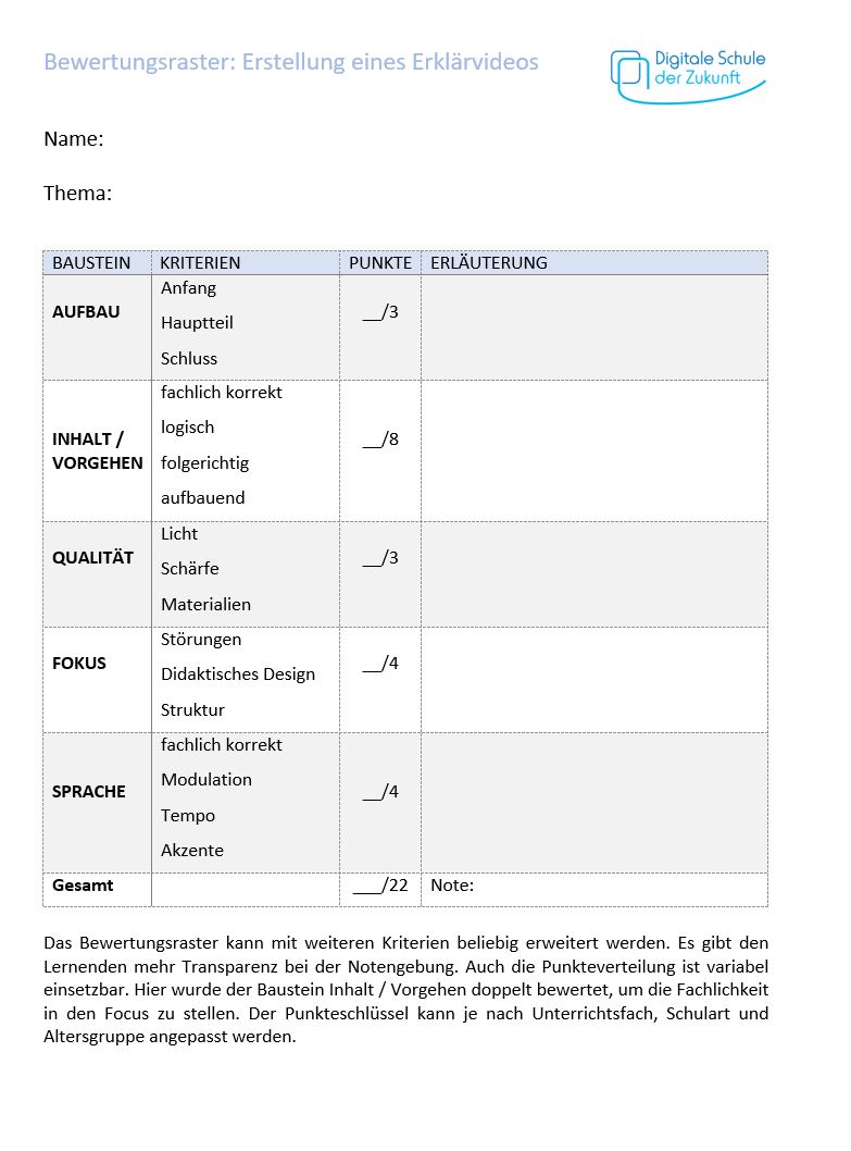 Die von Schülerinnen und Schülern produzierten Videos können zum Beispiel über eine Lernplattform eingereicht und damit auch Mitschülerinnen und Mitschülern zur Verfügung gestellt werden. Ein Bewertungsraster dient als Grundlage für das Feedback an die Lernenden, das auch Grundlage für Leistungserhebungen sein kann. Dabei werden die unterschiedlichen Ebenen der Bewertung wie Inhalt, kreative Umsetzung und formale Korrektheit transparent gemacht. Ob diese einzeln bepunktet werden oder eine inhaltliche, schriftliche Rückmeldung dazu erfolgt, obliegt der Lehrkraft.