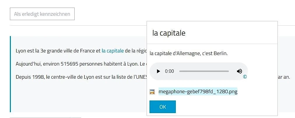 Die Lernenden können selbstgesteuert entscheiden, ob sie eine Vokabelerklärung für das inhaltliche Textverständnis benötigen oder nicht. Im Glossar kann auch eine Audiospur angelegt werden, falls sich Lernende der korrekten Aussprache versichern können sollen. Die Aktivität Glossar bietet also zusätzliche Informationen bzw. Hilfestellungen an.