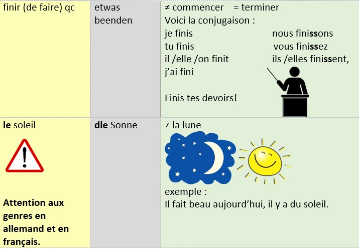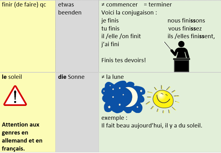 Wie sieht der Vokabelteil in Lehrbüchern im Fremdsprachenunterricht typischerweise aus? Am Ende des Buches findet sich meist eine dreispaltige Tabelle mit den Vokabeln der Lektion und ihrer deutschen Übersetzung. In einer weiteren Spalte wird der Kontext thematisiert, oft befinden sich dort auch noch zusätzliche Hinweise wie Bilder oder weitere Informationen: