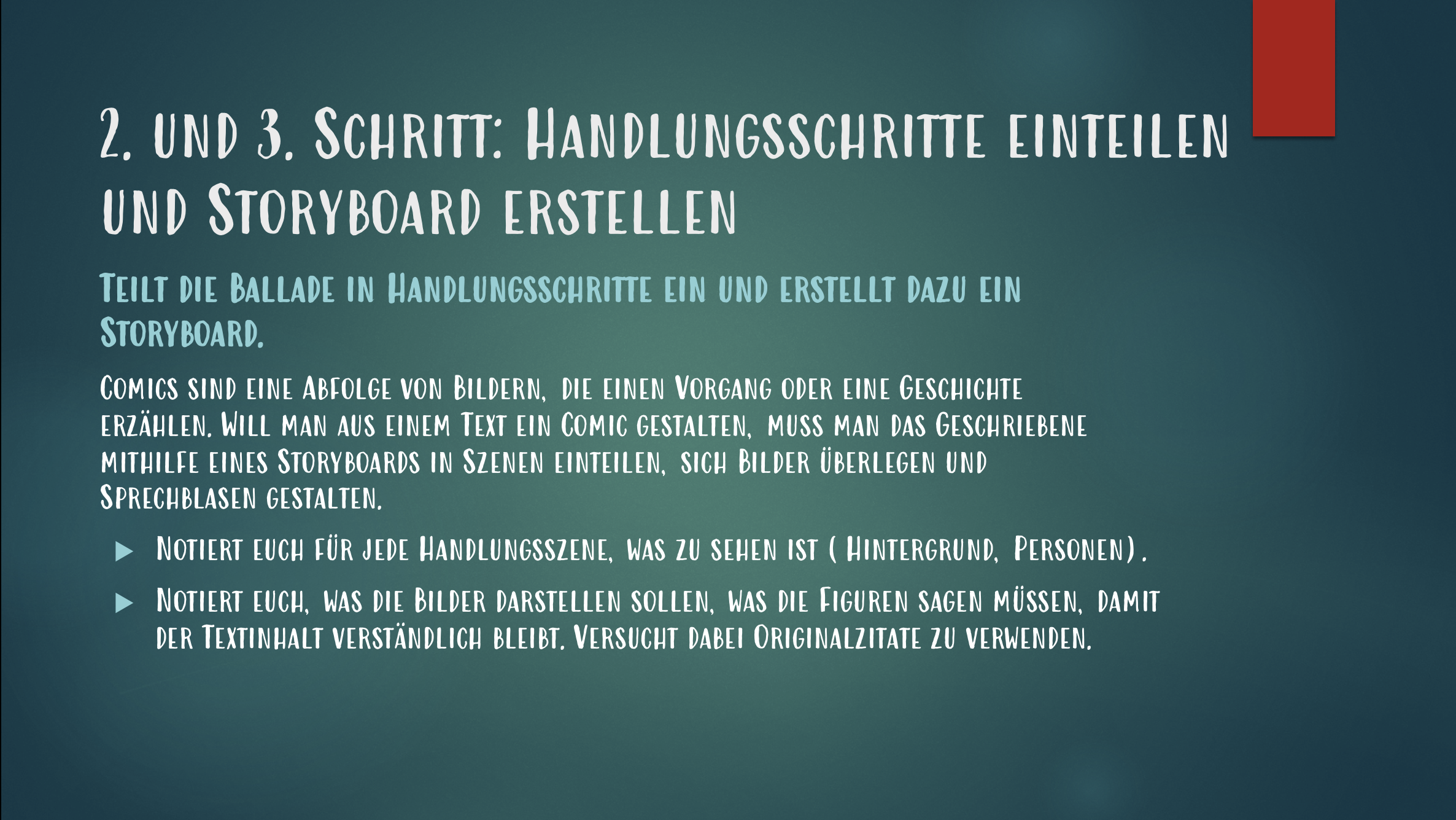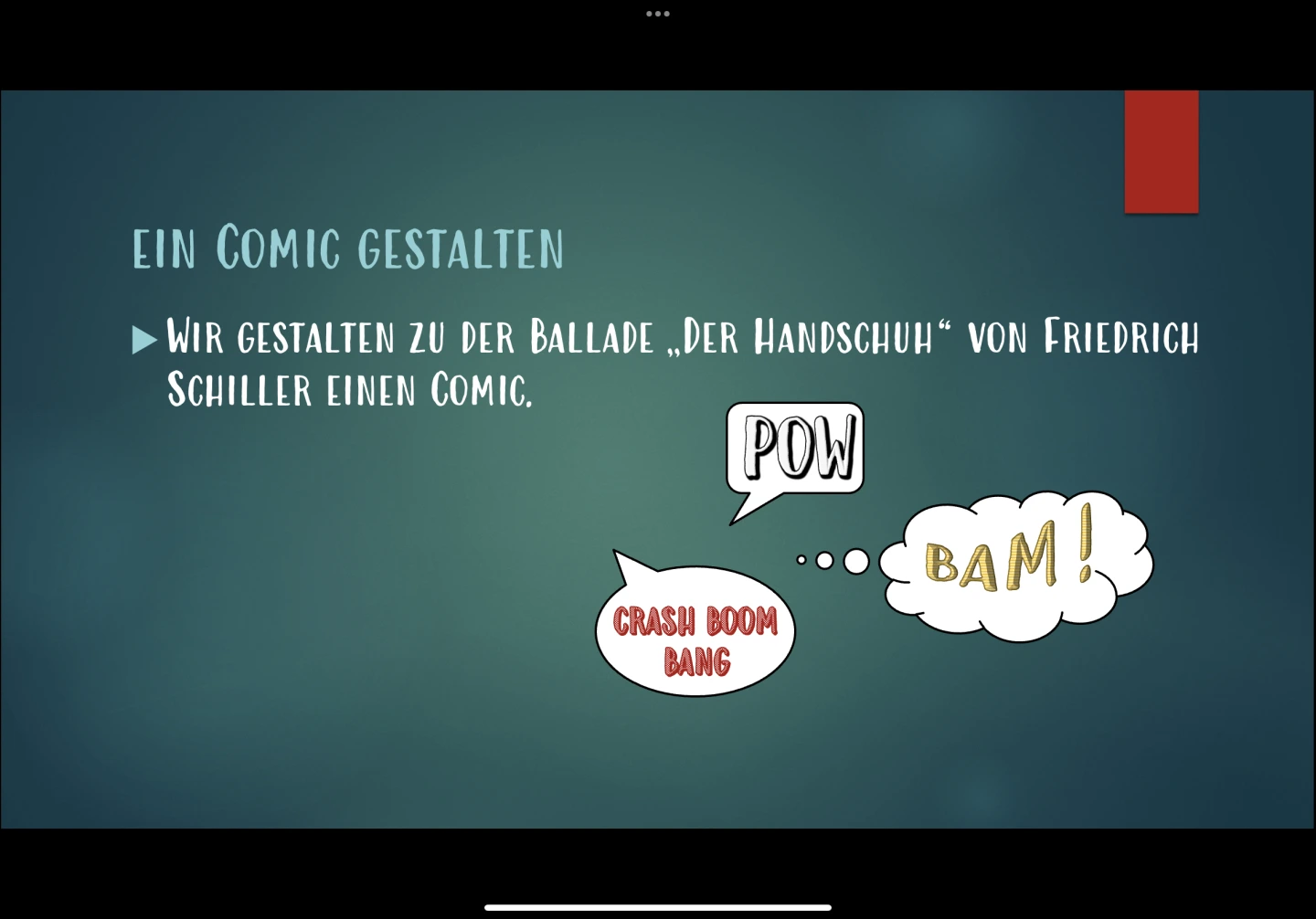 Die inhaltliche und textproduktive Auseinandersetzung mit literarischen Schriften ist ein wesentlicher Bestandteil des Deutschunterrichts an allen Schularten. Balladen bieten sich als literarische Kurzform besonders an, da sie Merkmale von epischen, lyrischen und dramatischen Texten in sich vereinen. In diesem Unterrichtsbeispiel wird der Inhalt der Ballade „Der Handschuh“ von Friedrich Schiller anhand eines Comics wiedergegeben. Die Lernenden arbeiten dabei in einem Zeitraum von sechs bis acht Unterrichtsstunden in Gruppen von drei bis vier Schülerinnen und Schülern. Bevor es an die Gestaltung des Comics geht, wird im Vorfeld der Inhalt der Ballade erschlossen. Außerdem ist es sinnvoll, einzelne Handlungsschritte zur Erstellung des Comics zu besprechen und zu visualisieren.