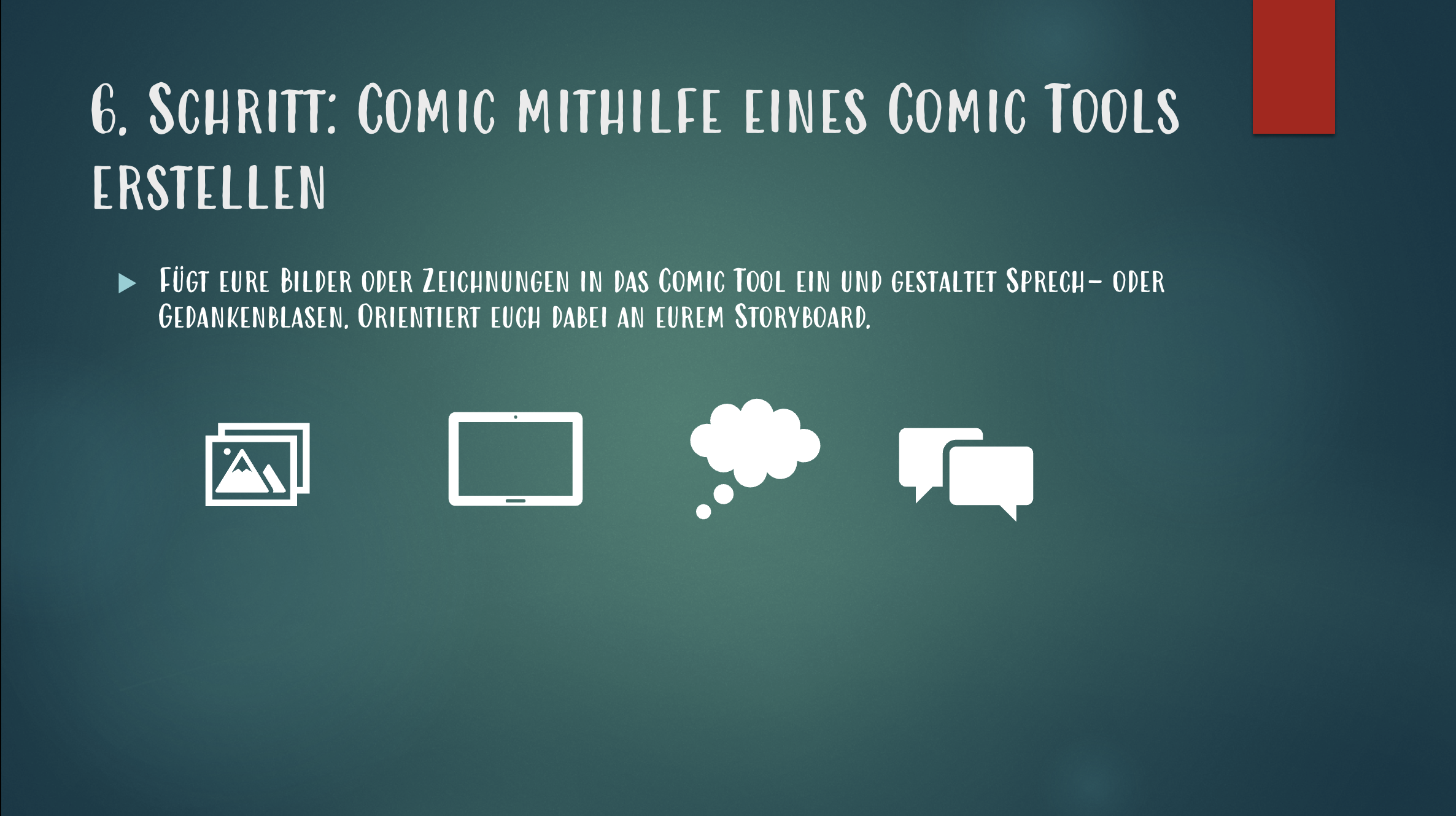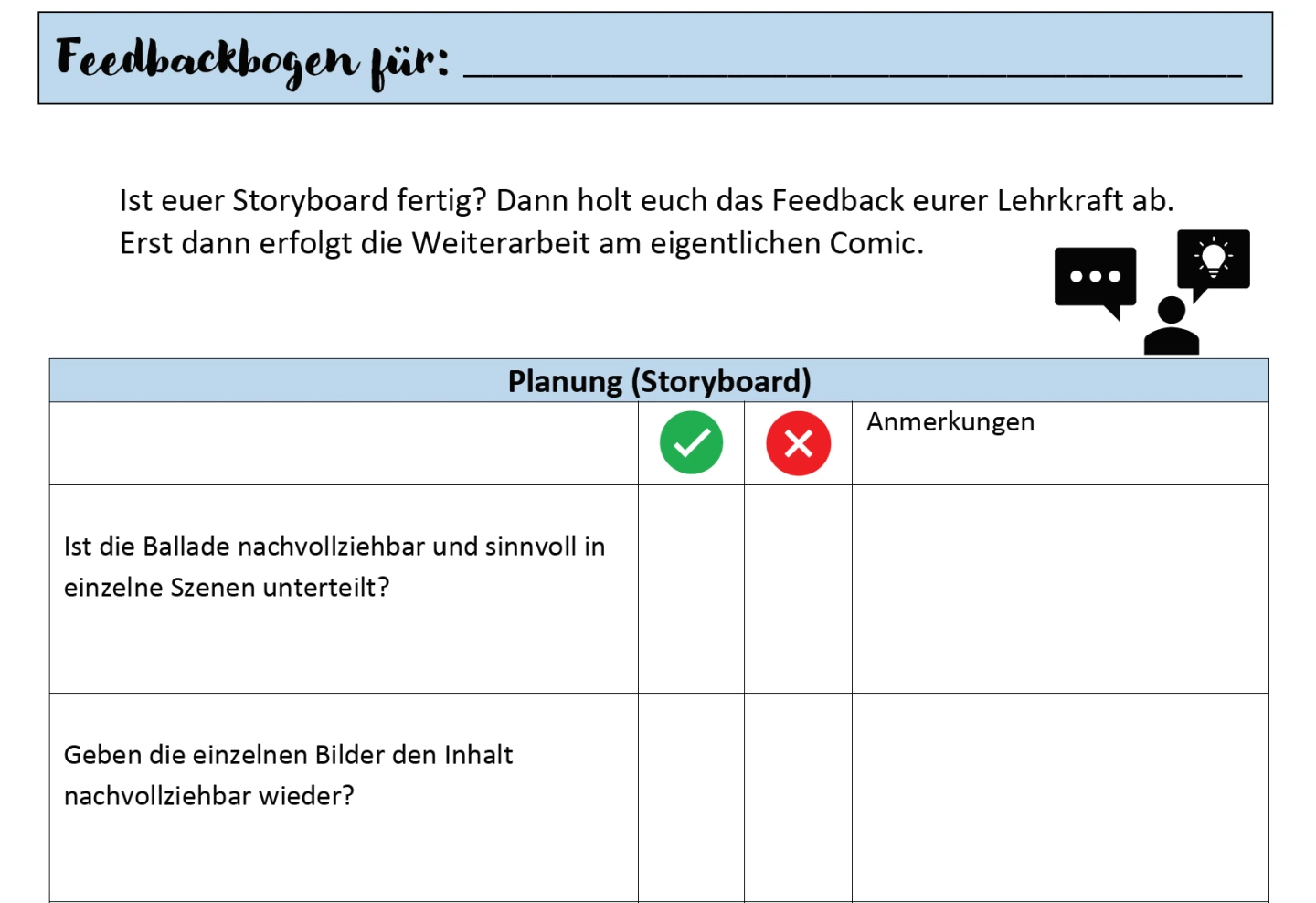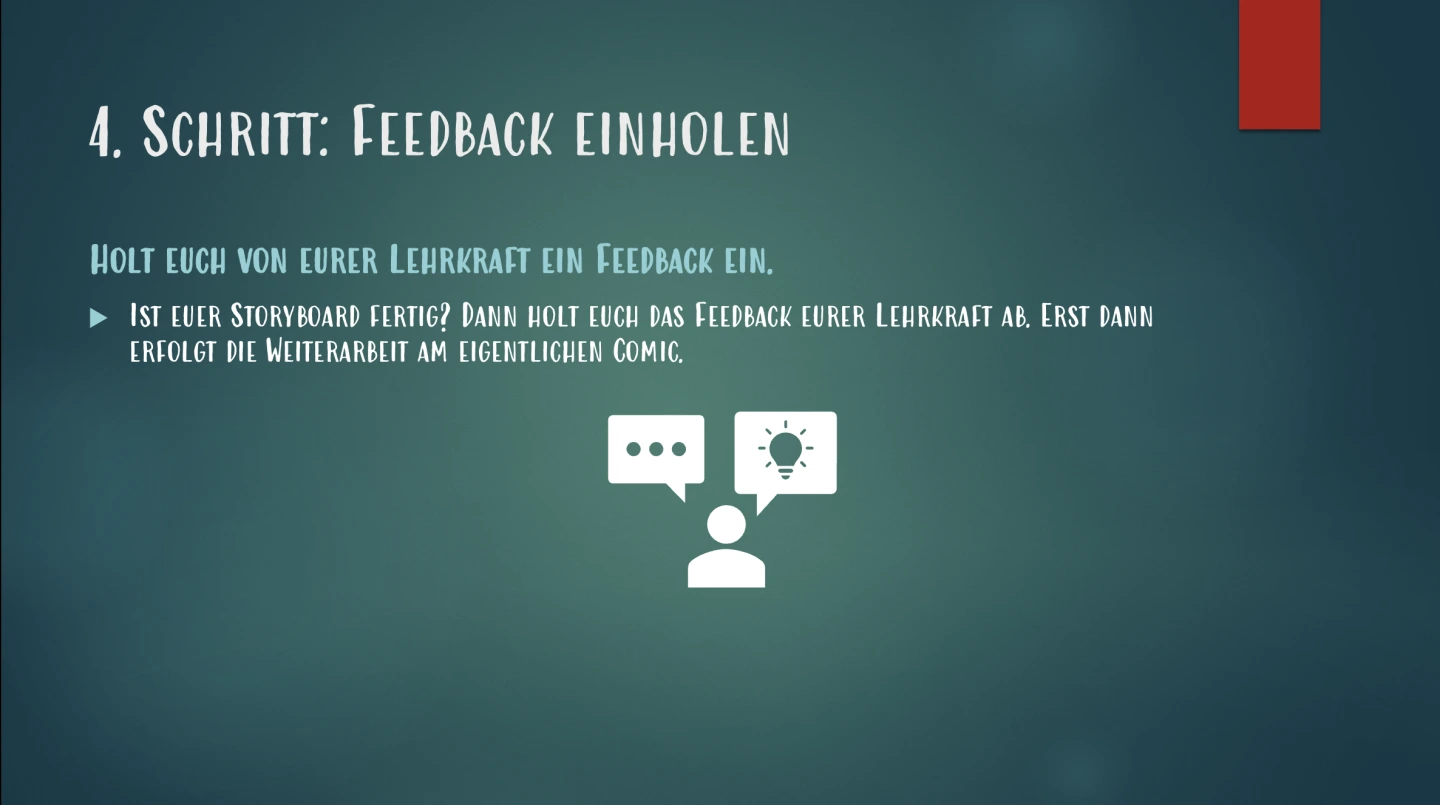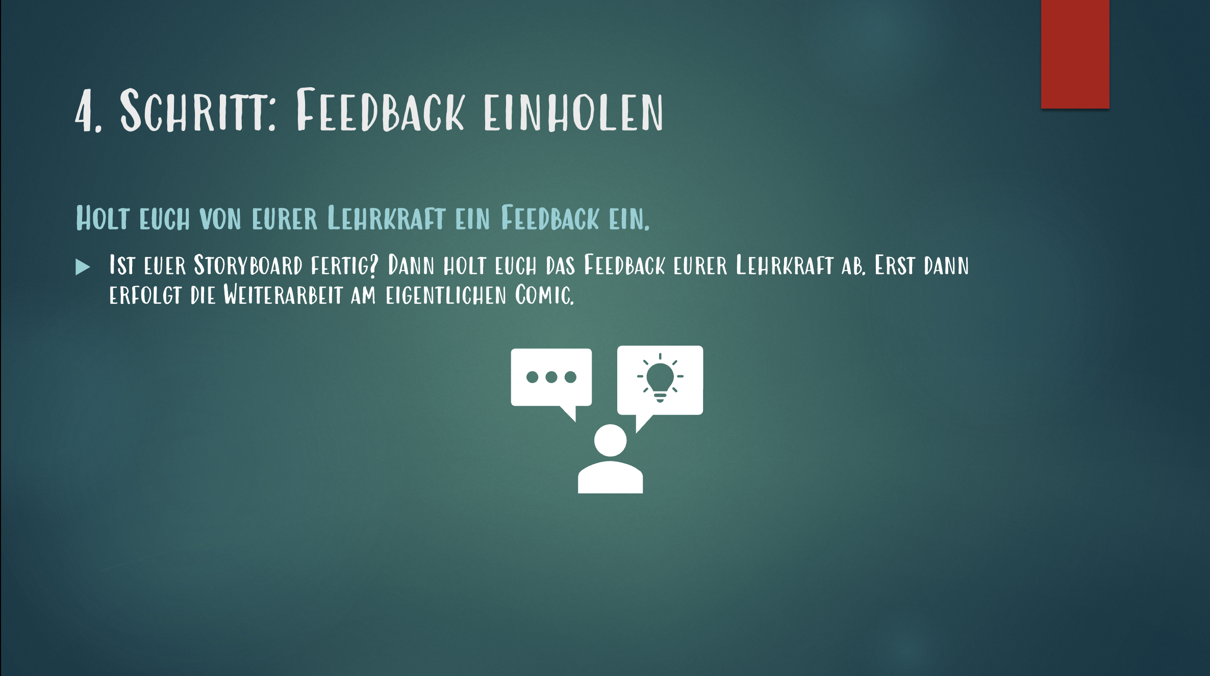Bevor der eigentliche Comic mithilfe eines entsprechenden Tools erstellt wird, ist es ratsam, ein Feedback von der Lehrkraft einzuholen. Erst dann erfolgt die Weiterarbeit.