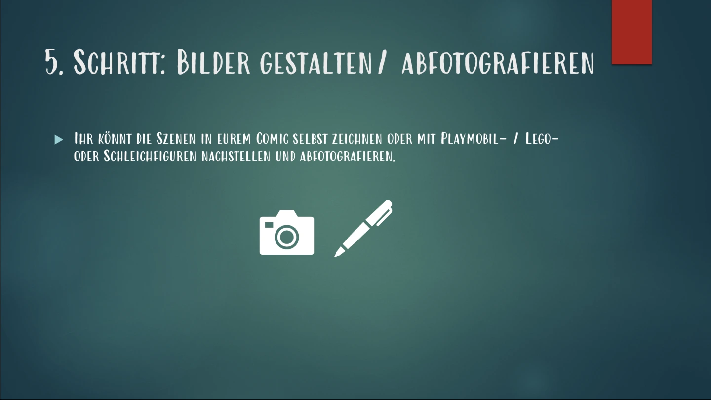 Das Zeichnen der einzelnen Bilder per Hand nimmt viel Zeit in Anspruch. Eine mögliche Lösung ist das Auslagern nach Hause oder den Schülerinnen und Schülern zu empfehlen, die Szenen mit Figuren nachzustellen und abzufotografieren.