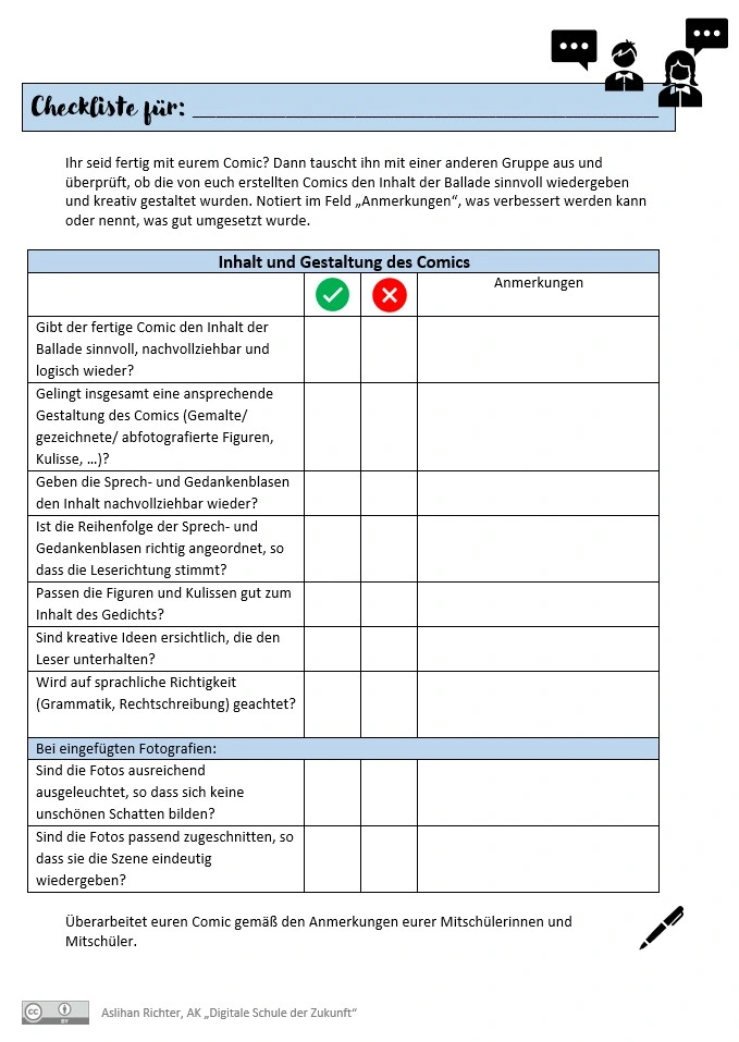 Anhand einer Checkliste werden die fertigen Comics von Mitschülerinnen und Mitschülern überprüft. Lernende erhalten Anregungen für eine Überarbeitung ihres Materials.
