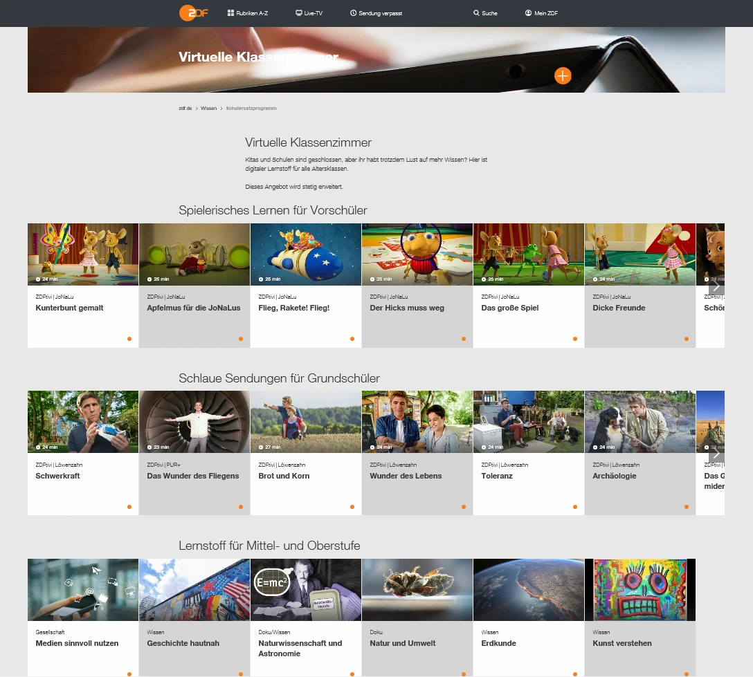 Das ZDF hat ein „virtuelles Klassenzimmer” eingerichtet. Die Videos in diesem eigenen Bereich der ZDF-Mediathek sind nach Altersgruppe sortiert zugänglich: