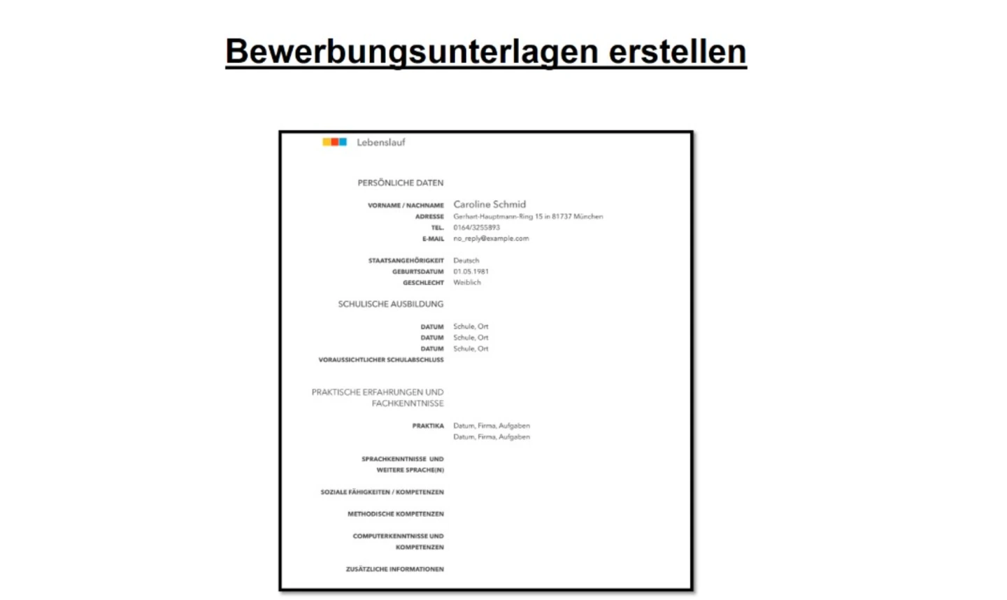 Das Erstellen von Bewerbungsunterlagen erfordert bei einer Vielzahl von Schülerinnen und Schülern mit den Förderschwerpunkten Lernen, geistige Entwicklung und Sprache sehr viel Zeit.Eine Ausstattung mit mobilen Endgeräten ermöglicht es, diese Unterlagen im Klassenzimmer zu individuell passenden Zeiten zu erstellen.