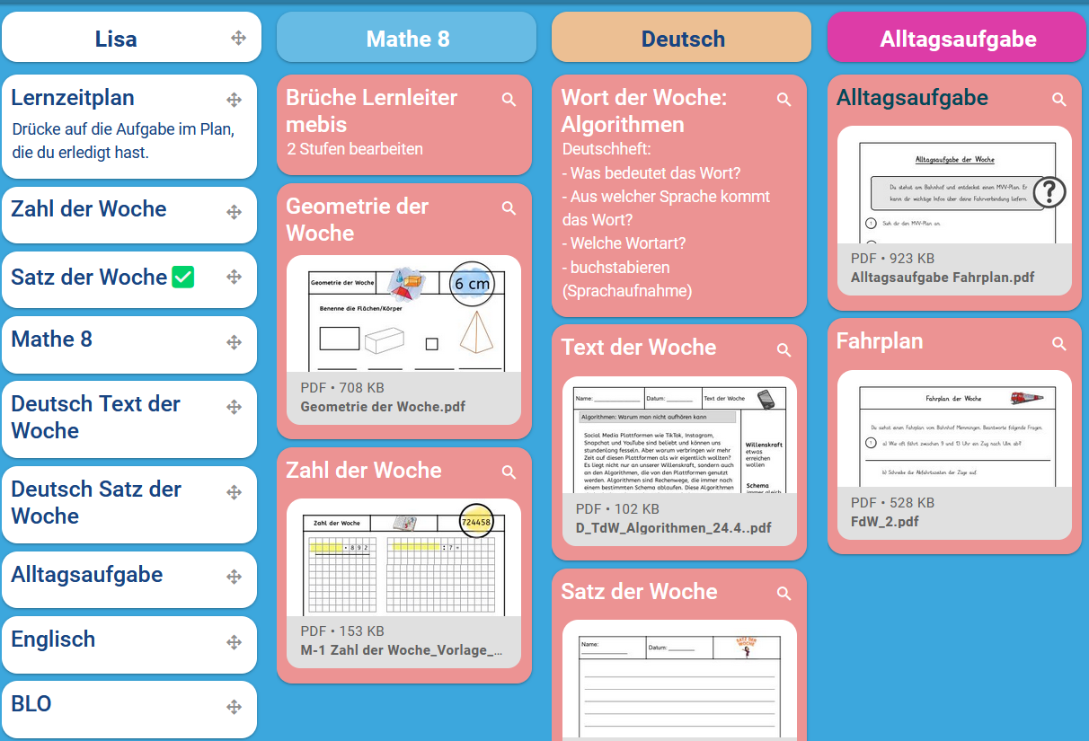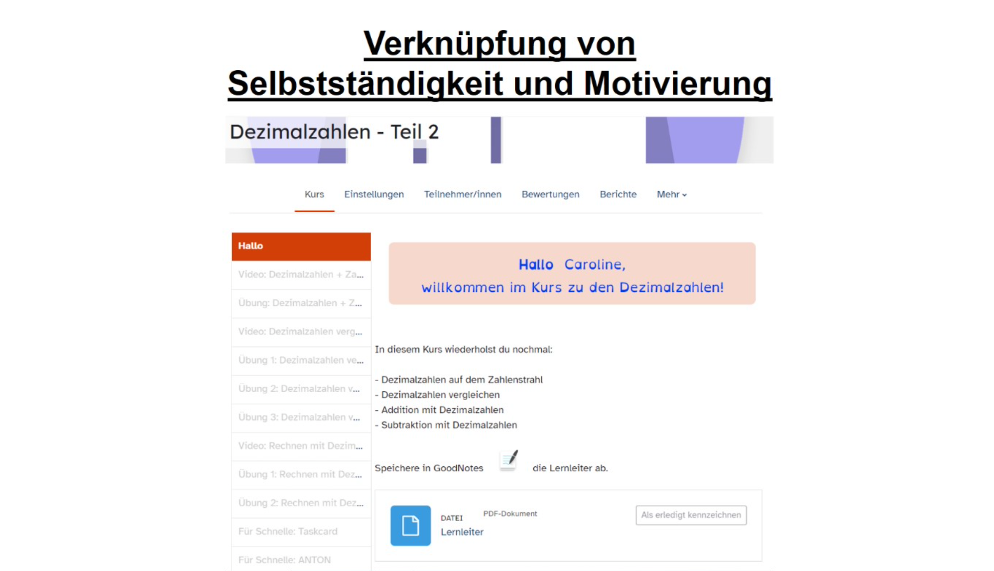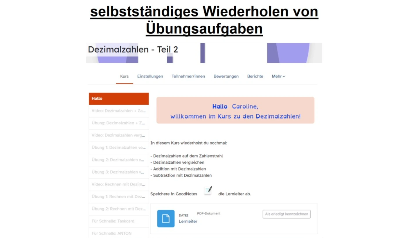 In themenspezifischen Kursen haben die Schülerinnen und Schüler die Möglichkeit, Inhalte selbstständig zu wiederholen. Abwechslungsreiche Übungsformate wie interaktive Aufgaben, Arbeitsblätter, H5P-Übungen oder Videos steigern zudem die Motivation für die Lernenden.