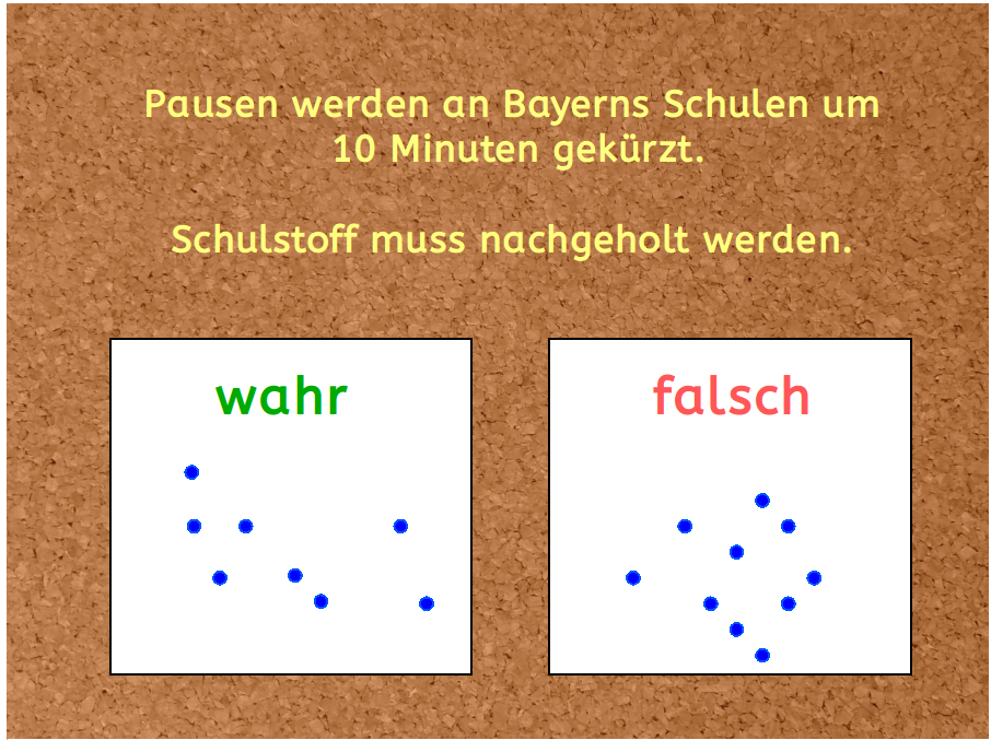 Lehrkräfte und Lernende stimmen ab, ob eine Aussage wahr oder falsch ist. Passend zur Aussage werden Quellen oder Zeitungsartikel angegeben. Diese können mit entsprechenden Tools selbst geschrieben werden.