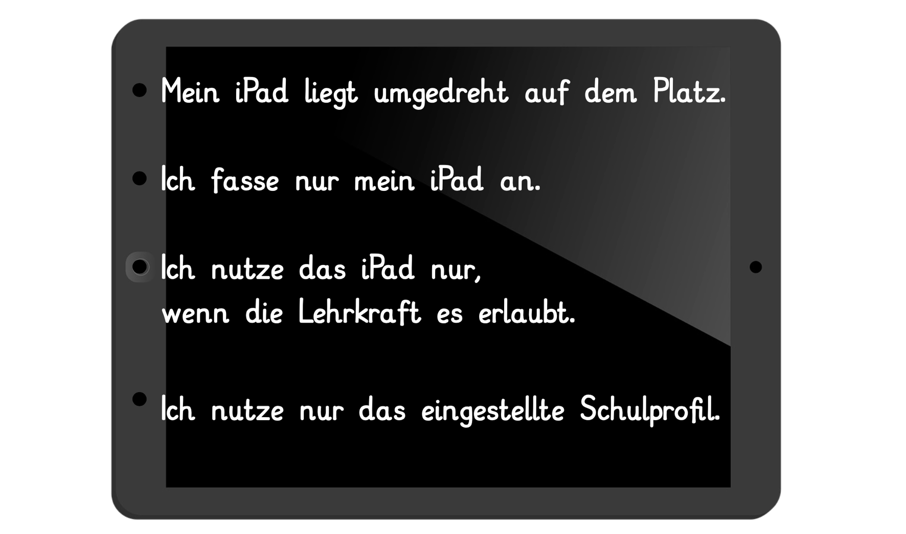 „Am Elternabend haben die Lehrkräfte uns Eltern gezeigt, wie wir die Bildschirmzeit am Gerät einstellen können. Nun habe ich einen guten Überblick, was mein Kind mit seinem Gerät macht und wir sprechen gemeinsam darüber.“