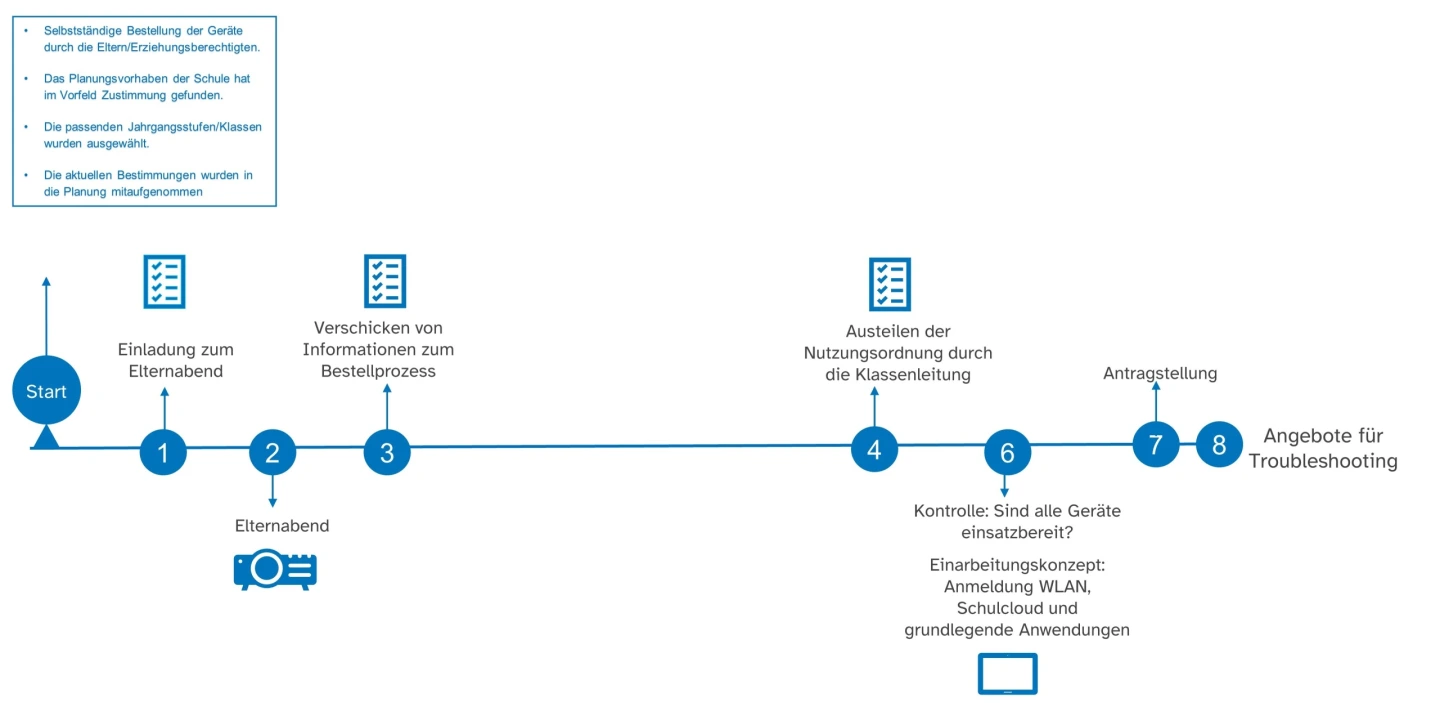 „Das Einrichten der Geräte sollen die Eltern mit ihren Kindern bereits zu Hause erledigen. Eine Einführung in die wichtigsten Programme und die Durchführung anderer wichtigen ersten Schritte und Initialprozesse wie die Anmeldung im WLAN der Schule und in der Schulcloud erfolgt in der ersten Novemberwoche. Nach der allgemeinen Technikeinführung wurde innerhalb des Schulungsteams vereinbart, dass man Probleme sammelt und gemeinsam Lösungen dafür sucht, um den Systembetreuer zu entlasten.“