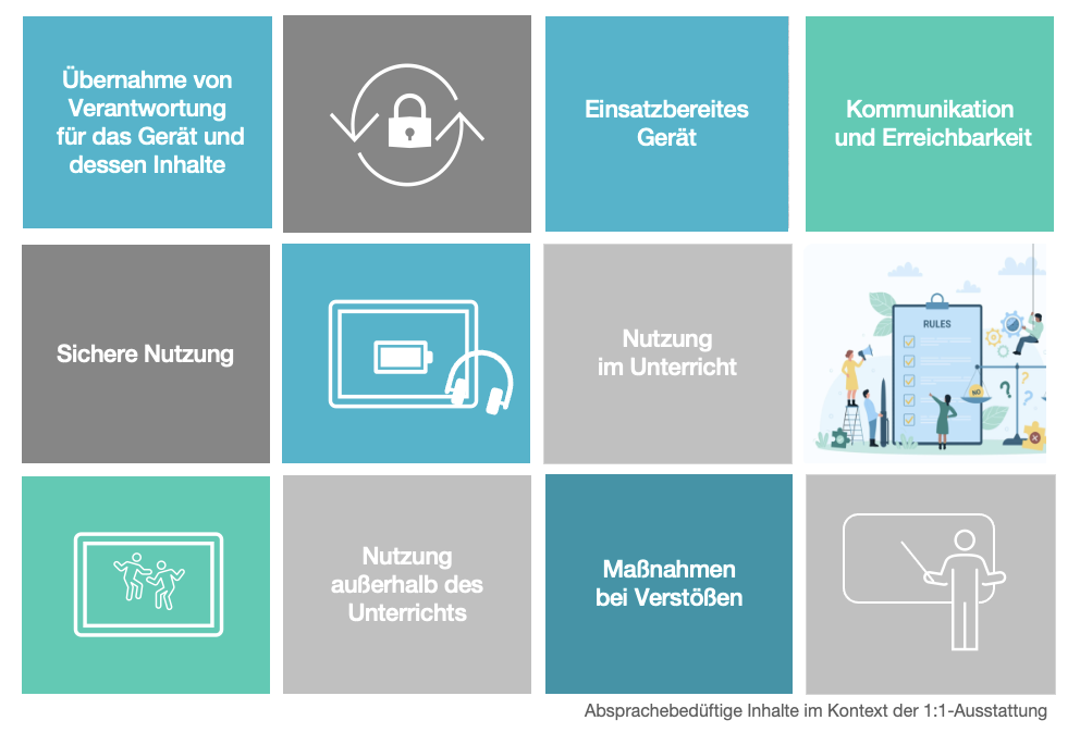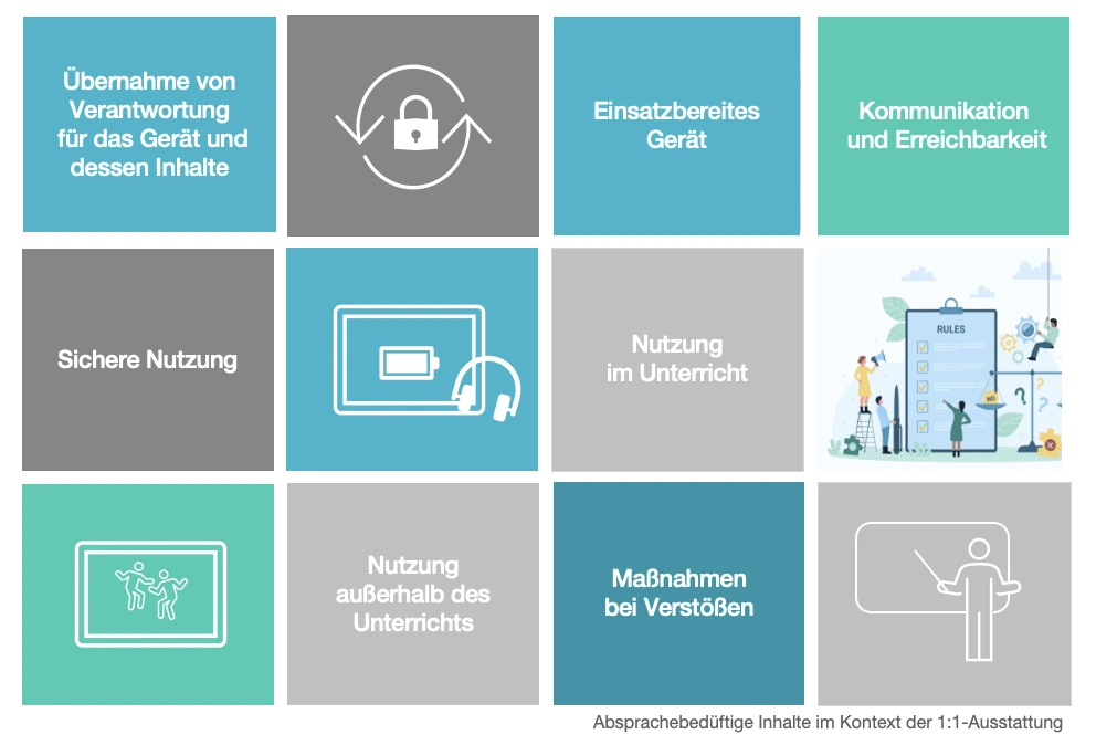 Die Einführung der 1:1-Ausstattung erzeugt nicht selten den Wunsch, die Nutzung von Tablets und Notebooks zu schulischen Zwecken an inner- und außerschulischen Lernorten entsprechend zu regulieren. Gemeinsame Absprachen und verbindliche Regeln schaffen einen verlässlichen Rahmen für alle Beteiligten. Der nachfolgende Artikel soll daher einen Überblick liefern, in welchen Bereichen Absprachen sinnvoll erscheinen und welche Reaktionsmöglichkeiten bei Regelverstößen bestehen und rechtlich durchführbar sind. Darüber hinaus erfahren Sie anhand von Praxisbeispielen, welche Regelungen andere Schulen erfolgreich etabliert haben.