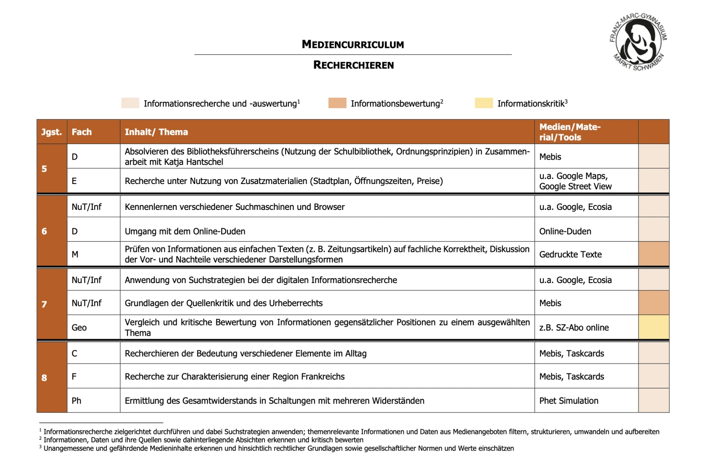 All diese Bausteine sollten auch im Medien- und Methodencurriculum der Schule verankert werden, damit Zuständigkeiten verbindlich festgelegt sind. Die Kompetenzen der Lernenden sind dabei über die Jahrgangsstufen hinweg gezielt zu trainieren.