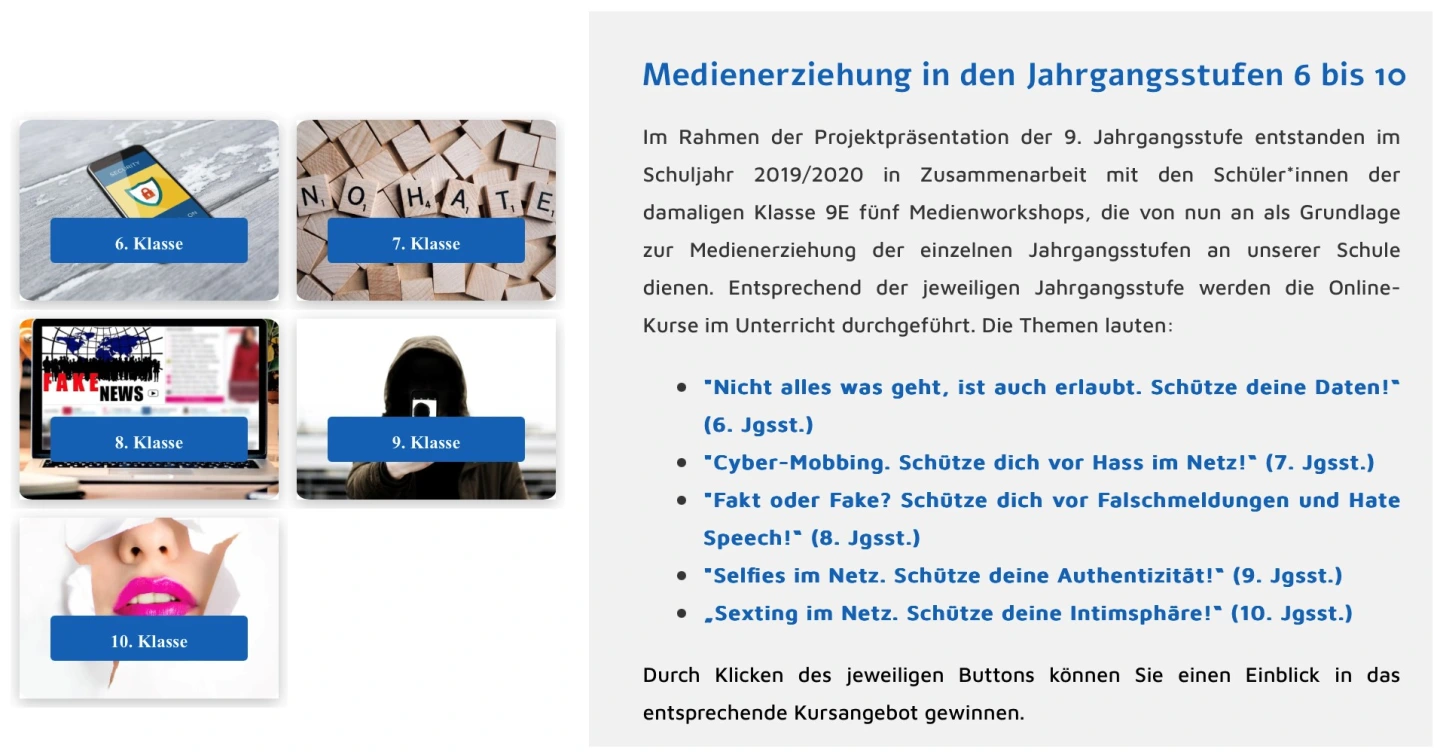 „Im Rahmen der Projektpräsentation der 9. Jahrgangsstufe entstanden fünf Medienworkshops, die von Lernenden für Lernende gestaltet wurden und so konzipiert sind, dass sie jederzeit ohne Einsatz von zusätzlichem Material oder Vorbereitungs- und Einarbeitungszeit durchgeführt werden können. Eine Umsetzung findet jährlich anlässlich des Safer-Internet-Days in der Klassenleiterstunde statt. Die Erziehungsberechtigten werden vorab darüber informiert, wobei die Workshops über die Schulhomepage für alle Mitglieder der Schulfamilie zugänglich sind, sodass auch zuhause ein Austausch über die jeweiligen Themen erfolgen kann.“