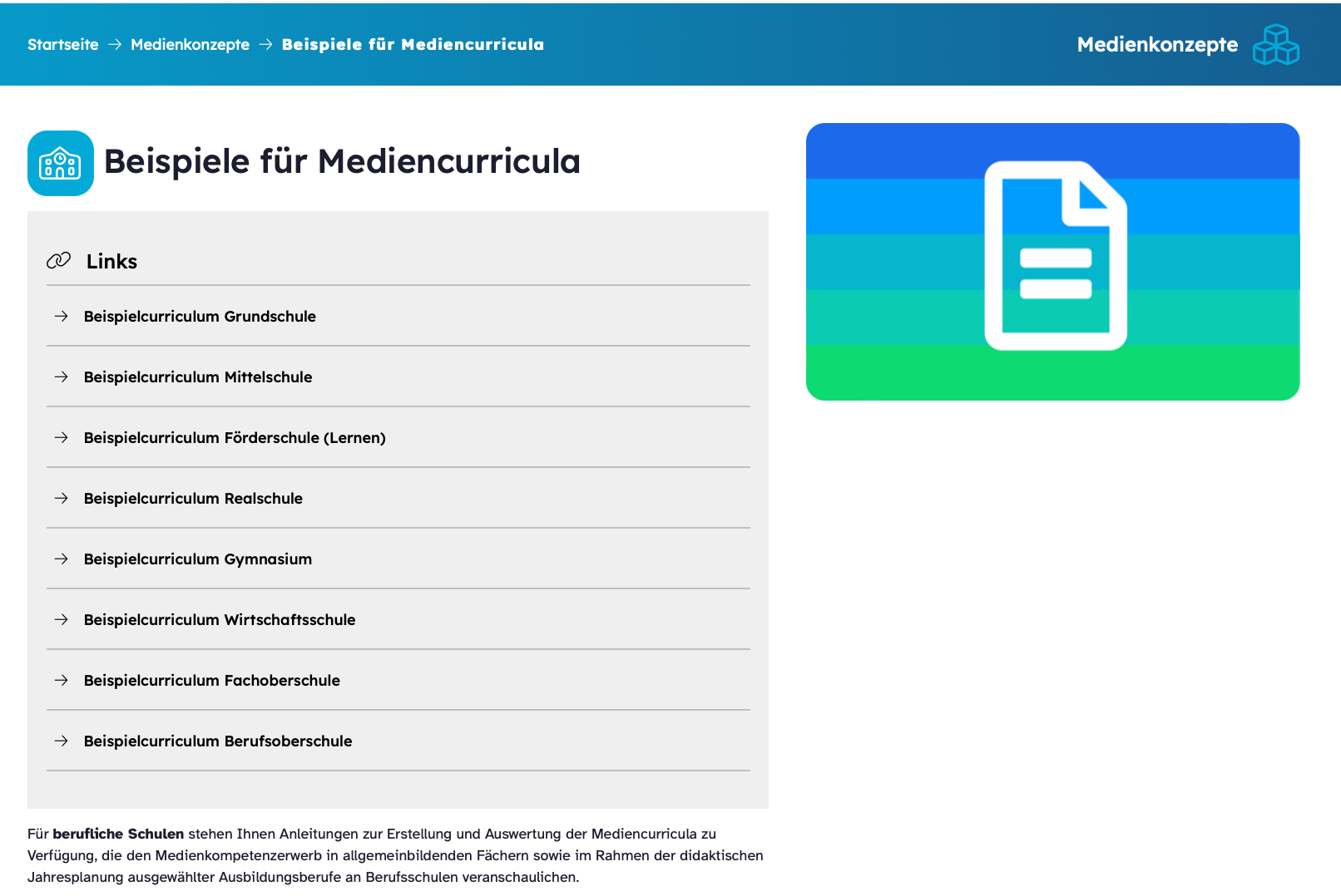 Das schuleigene Mediencurriculum ist hierfür ein nützliches Instrument der Planung. Daher ist es empfehlenswert, dieses frühzeitig an die 1:1-Ausstattung anzupassen bzw. eine tragfähige Basis für eine gemeinsame Weiterentwicklung zu legen.