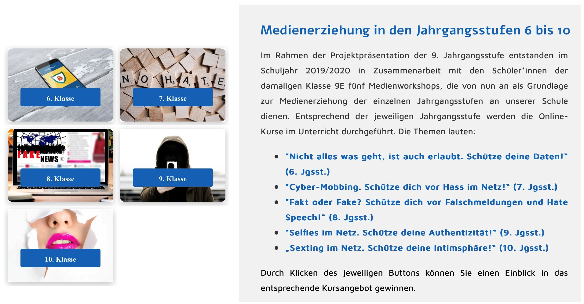 „In allen Jahrgangsstufen finden verteilt über das gesamte Schuljahr komplette Schultage als Projekttage zum Themenbereich „Medienerziehung“ statt. Sie sollen zur Förderung der Medienkompetenz bei Schülerinnen und Schülern beitragen. Die Projekttage finden abseits vom regulären Unterricht statt, um möglichst losgelöst von Fachlehrkräften und Notendruck über wichtige Aspekte zu sprechen. Durchgeführt werden die Projekte von Peers des Medienkunde-Kurses der Oberstufe und von Kolleginnen und Kollegen des Medienteams der Schule. Je nach Schwerpunktsetzung der einzelnen Schule müssen gerade bei einer 1:1-Ausstattung der zeitliche Ablauf und die Reihenfolge der Inhalte angepasst werden.“