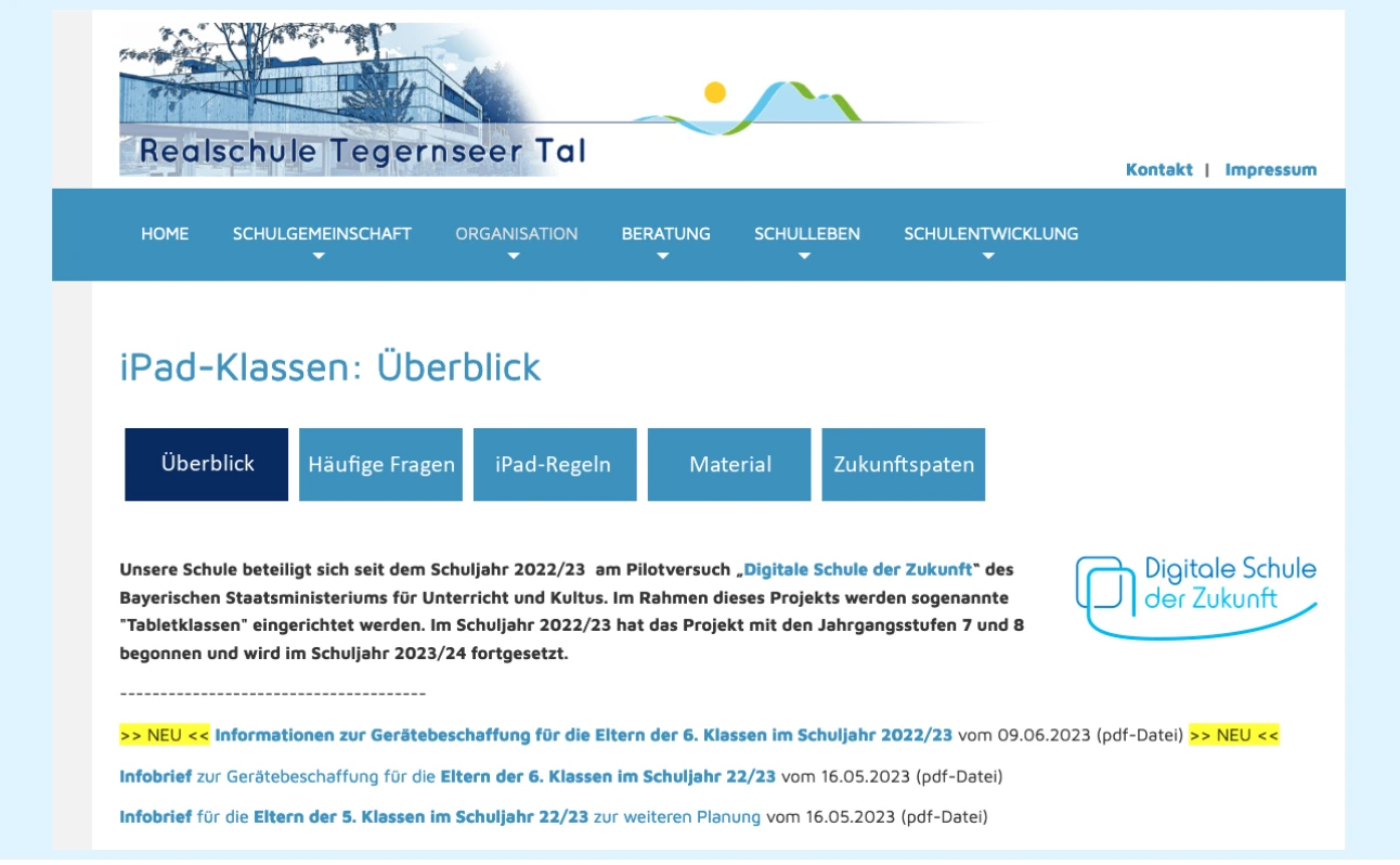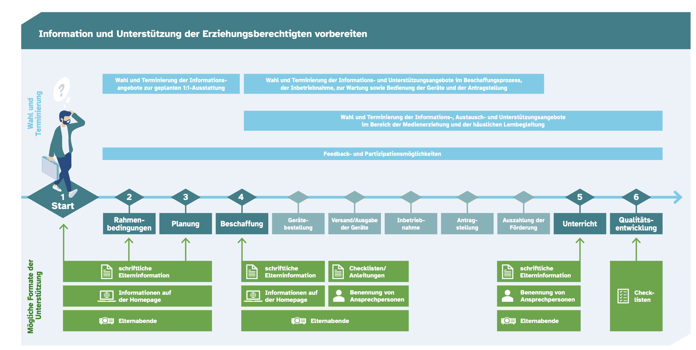 Eine Unterstützung seitens der Schule kann dabei auf unterschiedliche Weise z. B. im Rahmen von digitalen Elterninformationen (Videokonferenzen), Elternabenden oder Informationsschreiben geschehen. Ziel ist hierbei eine möglichst problemlose Integration der Geräte in den Schulalltag.