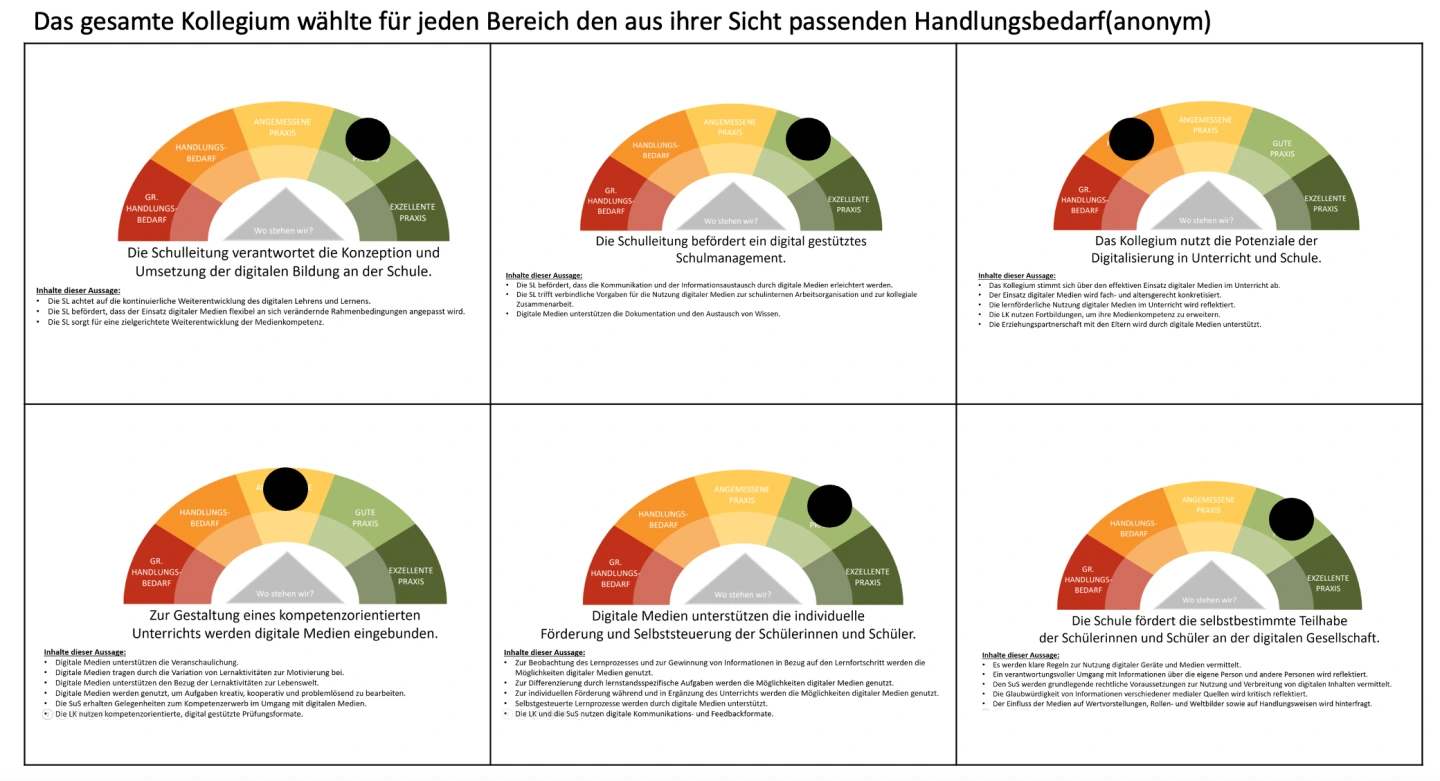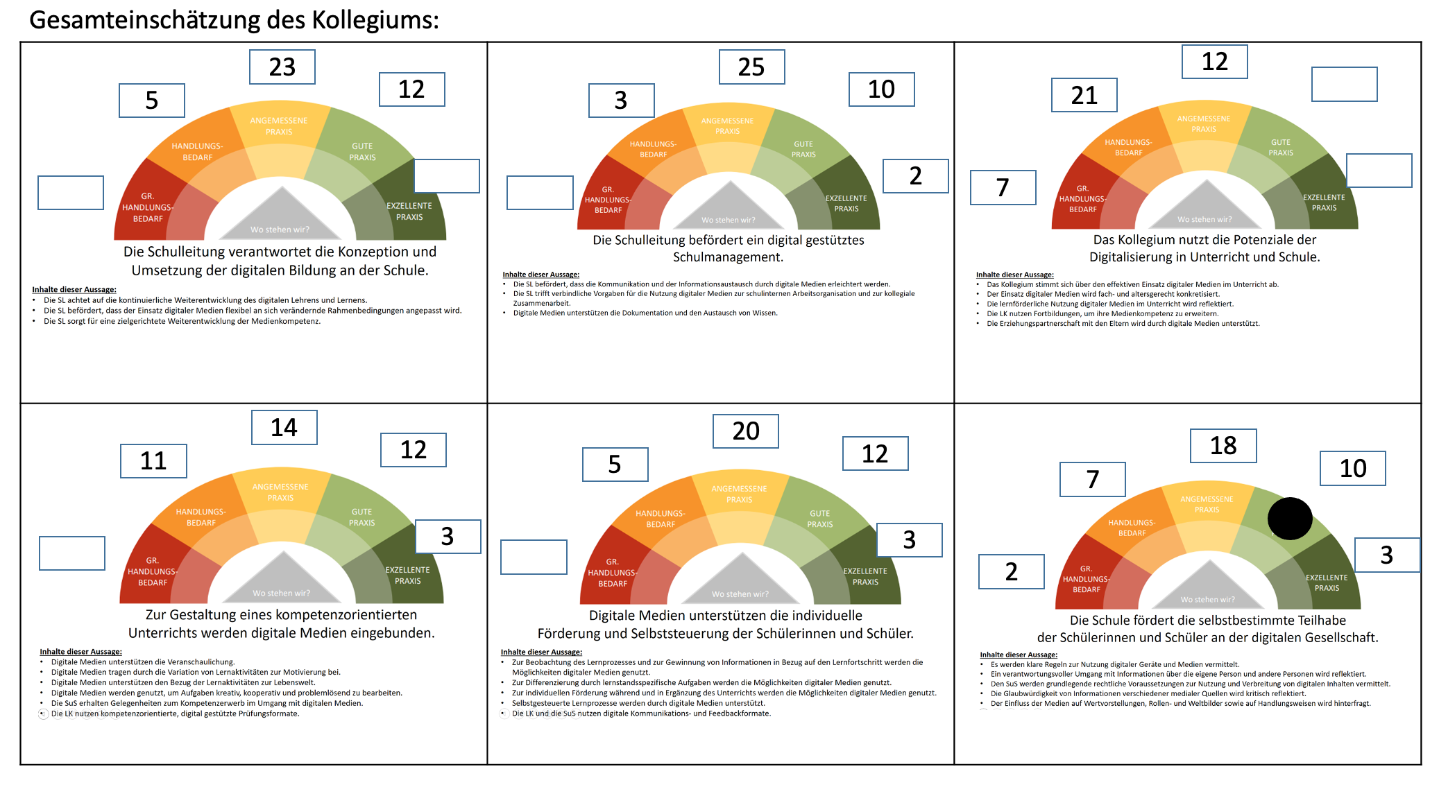 Das gesamte Kollegium erhält die Möglichkeit, sich anonym an einer Umfrage zu beteiligen. Jede einzelne Person schätzt zunächst für sich ein, inwiefern er oder sie die Anforderung an der Schule insgesamt erfüllt sieht. Die Einschätzungen können durch Notizen erläutert werden.
