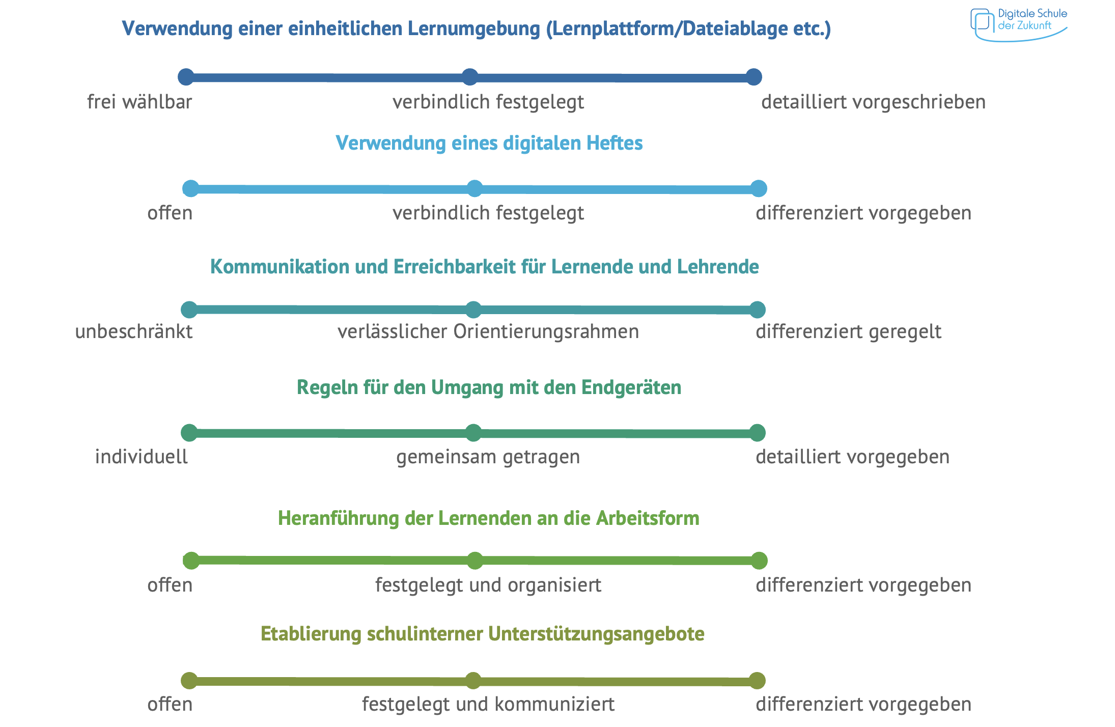 Das Lernen in einem 1:1-Setting schafft neue Anreize für eine verstärkte Kooperation der Lehrenden, fördert das eigenständige, handlungs- und produktionsorientierte Arbeiten der Lernenden und ermöglicht die Integration digitaler Unterrichtsmethoden sowie eine sich daraus ergebende veränderte Aufgabenkultur. Damit kann die Integration digitaler Unterrichtsmedien zum einen, die Notwendigkeit einer Anpassung der bestehenden Rahmenbedingungen an einer Schule erfordern. Zum anderen können veränderte Rahmenbedingungen genau diese Entwicklungen unterstützen. Dabei sind folgende Aspekte von Interesse: