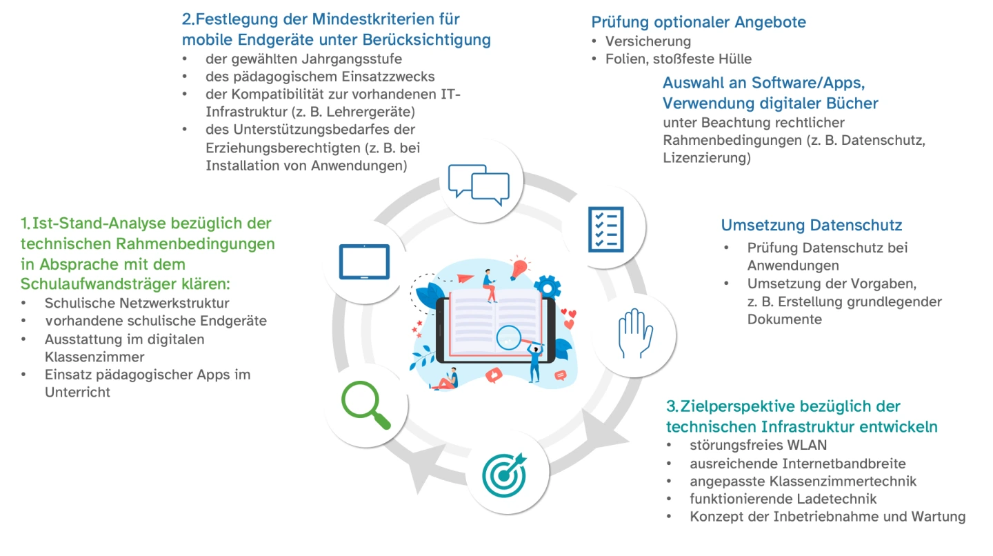 Diese Einschätzungen können einerseits dabei helfen, zu entscheiden, inwieweit die Infrastruktur der Schule bereits die notwendigen Voraussetzungen für die effektive Arbeit mit Schülerendgeräten erfüllt. Andererseits sind sie der Ausgangspunkt für die Festlegung der technischen Mindestkriterien der mobilen Endgeräte der Schülerinnen und Schüler. Ziel ist es, eine technisch stabile Infrastruktur für alle Beteiligten zu gewährleisten.