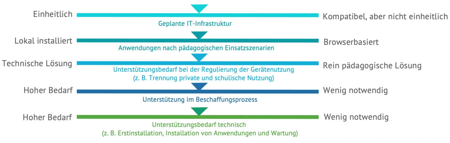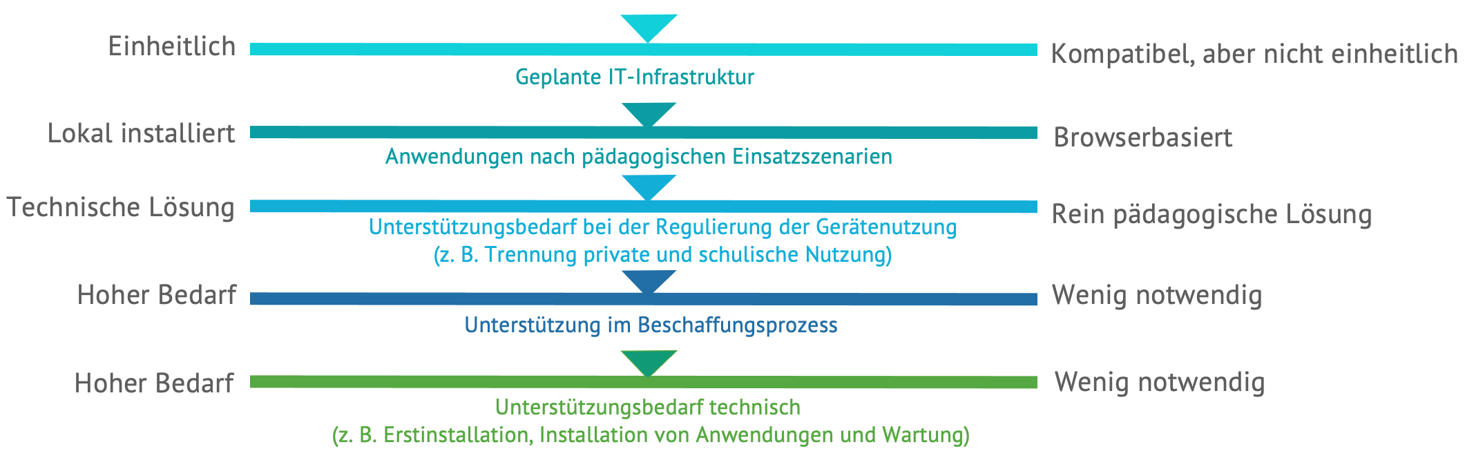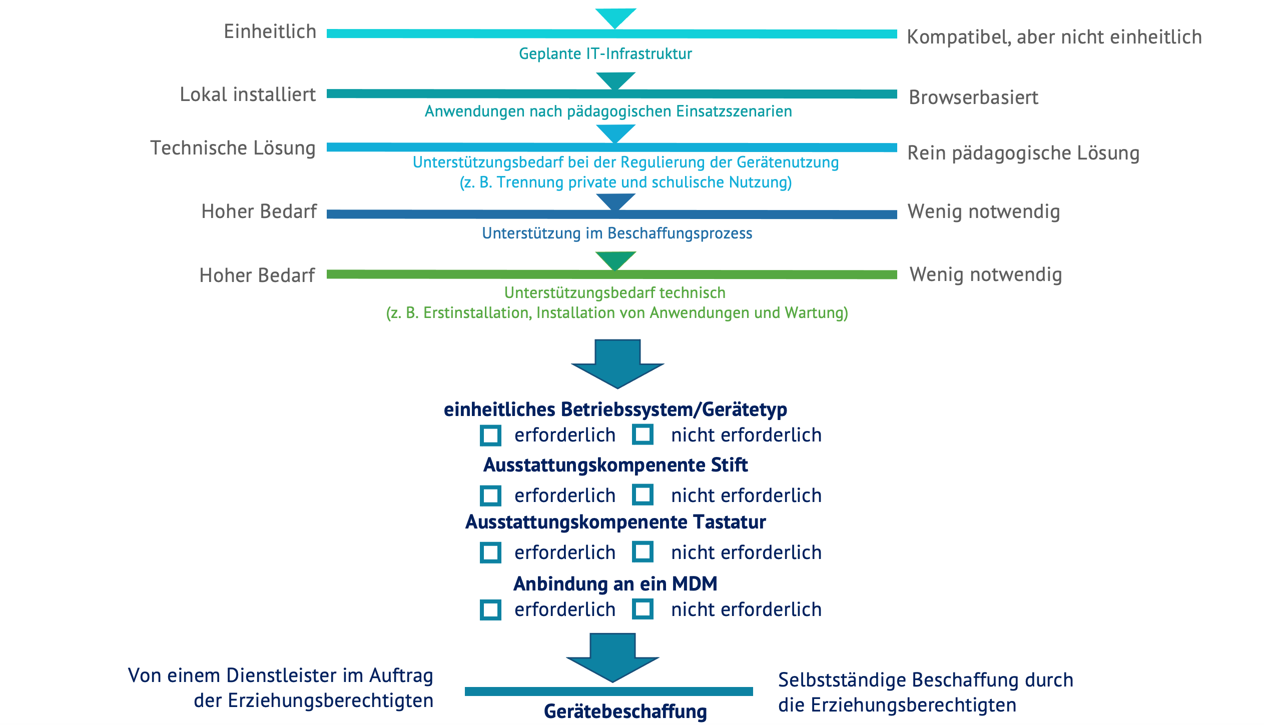 Jede Schule verfolgt auf Basis des schuleigenen Medienkonzepts einen passgenauen pädagogisch-didaktischen Ansatz im Bereich der Medienbildung und verfügt über eine darauf ausgerichtete technische Ausstattung. Diese individuellen Gegebenheiten vor Ort müssen bei der technischen Umsetzung eines 1:1-Ausstattungskonzepts berücksichtigt werden. Hinzu kommen Fragen zur Beschaffung, Administration sowie zur Wartung der Geräte, die von Beginn an mitgedacht werden müssen. Im Folgenden soll aufgezeigt werden, wie anhand einfacher Fragestellungen die passenden technischen Mindestkriterien für die mobilen Endgeräte der Lernenden definiert werden können.