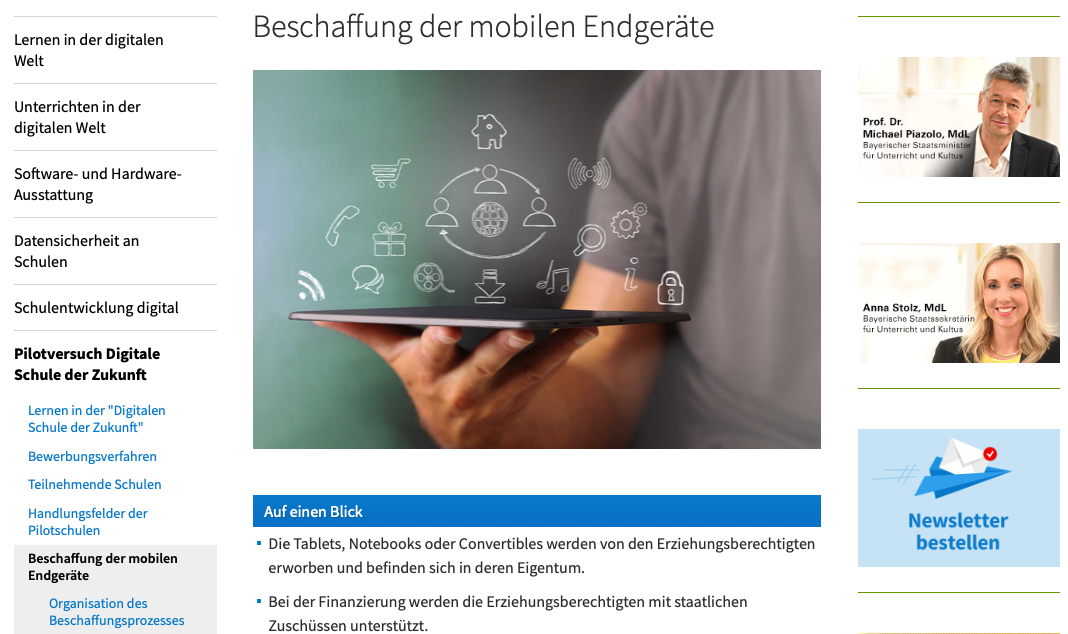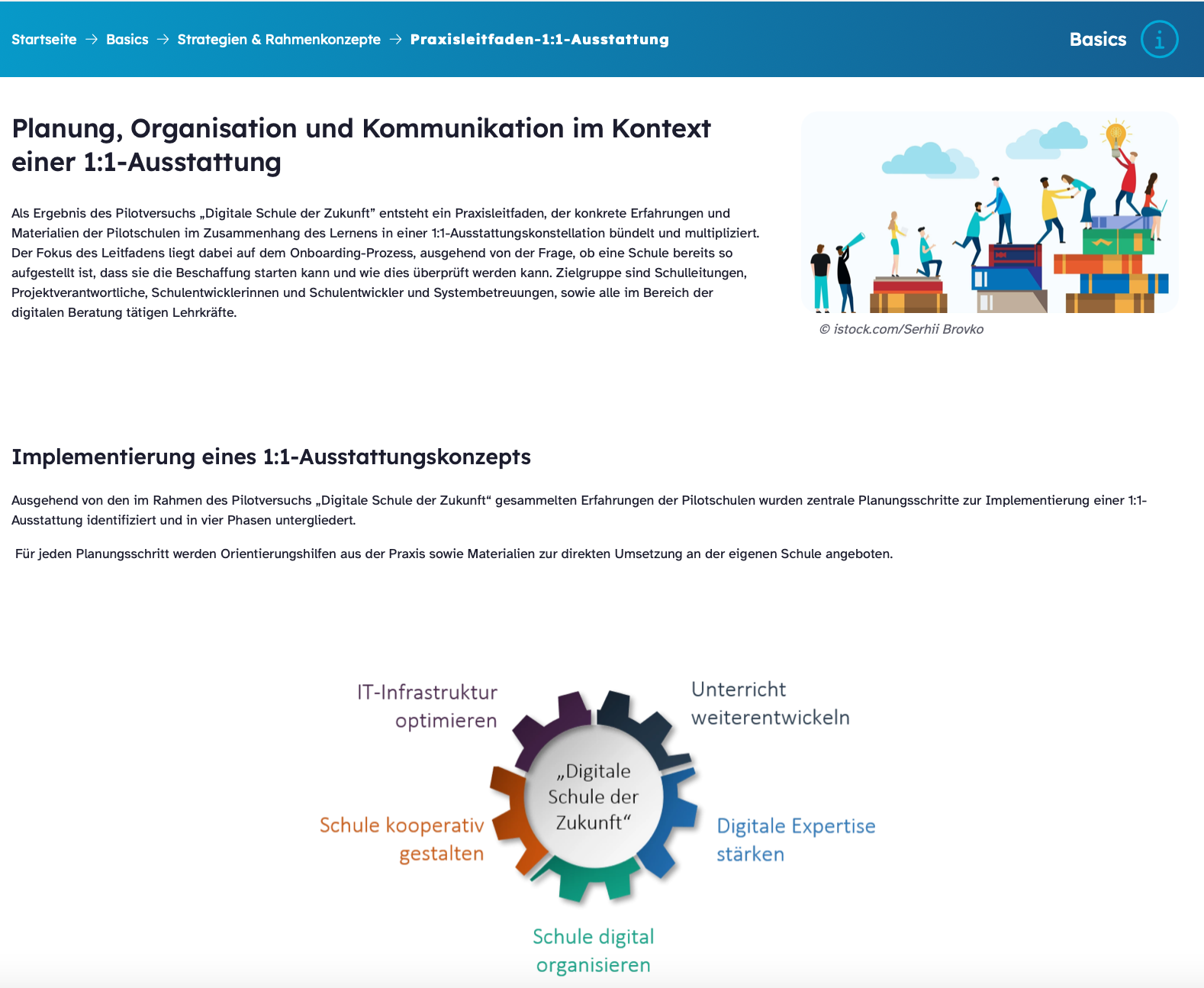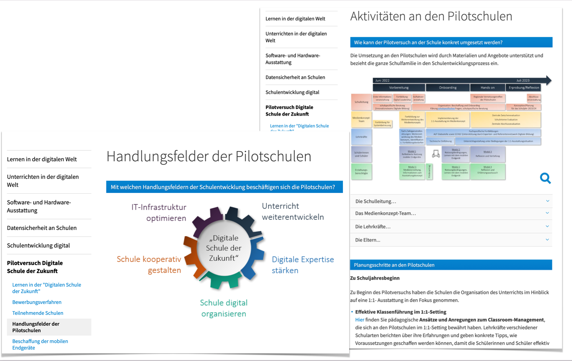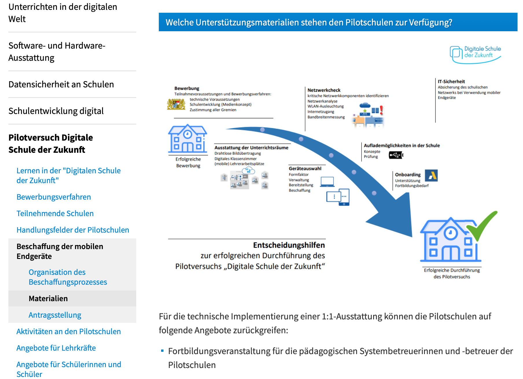Neben der vorliegenden Handreichung wurden im Rahmen des Pilotversuchs „Digitale Schule der Zukunft“ zahlreiche Unterstützungsangebote geschaffen und den teilnehmenden Schulen zur Verfügung gestellt. Gerade für Schulen, die diese Chance nutzen und sich mithilfe des Pilotversuchs auf den Weg in die 1:1-Ausstattung machen, bieten die vielfältigen Angebote und Materialien eine hilfreiche Grundlage für die Entwicklung eigener Konzepte.