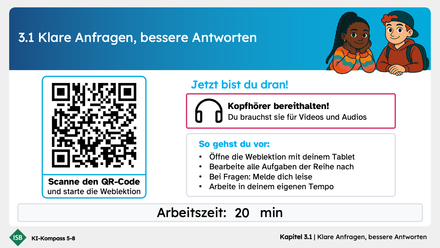 Zur WeblektionÜber den QR-Code auf dem Arbeitsblatt, das Sie hier herunterladen können, gelangen Ihre Schülerinnen und Schüler zur Weblektion und setzen sich individuell mit dem Thema “Klare Anfragen, bessere Antworten” auseinander.