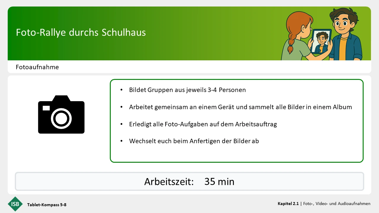Die Lektion „Foto,- Video- und Audioaufnahmen” und „Mit Dateien umgehen” sind so gestaltet, dass sie auch zusammen im Block (beispielsweise an einem Projekttag) hintereinanderweg bearbeitet werden können.